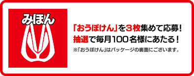 商品の中に入っている「大アタリ」シール×1枚もしくは「おうぼけん」×3枚を応募用紙またはお手持ちのハガキに貼り、必要事項(郵便番号・住所・氏名・年齢・電話番号)を明記の上、所定の郵便料金の切手を貼ってご応募ください。