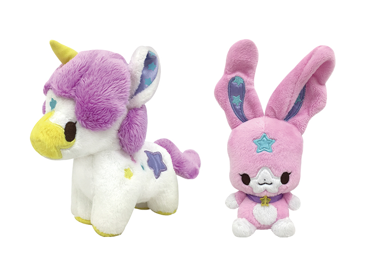 - ユニルとラビルが、ぬいぐるみになりました。体はふわふわ、お星さまはキラキラの布でアクセントに。パステルカラーでまとまった、ちょこんとした可愛いサイズのぬいぐるみです。