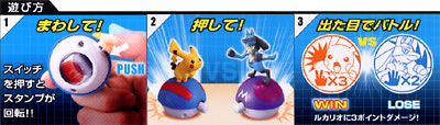 ボールのスイッチを押すとスタンプが回転、3つの印面のうちどれかがランダムで出ます。この出た絵柄で対戦バトルができる新感覚のホビーアイテムです。