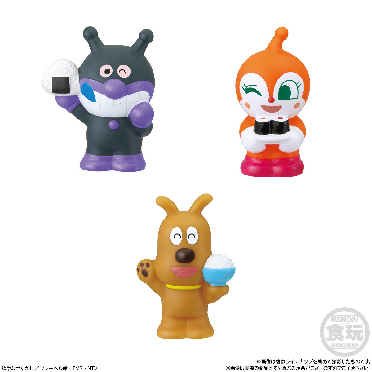 あつまれアンパンマンP77 お気に入り お気に入り登録とは? 価格 180円(税込:198円) 発売日 2023年3月20日 発売 売場 全国量販店の菓子売場等 対象年齢 3才以上 商品アンケート 『あつまれアンパンマン』シリーズ第77弾は「ごはん」がテーマ!おにぎりや鉄火巻きを持ったばいきんまんやドキンちゃんなど、ごはんを楽しむなかまたちが全9種♪アンパンマンたちと一緒にごはんを食べて、元気100倍になろう! ●彩色済みソフビ人形(全9種)1.アンパンマン2.カツドンマン3.てんどんまん4.かまめしどん5.おむすびまん6.てっかのマキちゃん7.ばいきんまん8.ドキンちゃん9.めいけんチーズ●ラムネ菓子1個 (C)やなせたかし/フレーベル館・TMS・NTV ※画像には複数ラインナップを組み合わせて撮影したものも含まれます。 ※価格はメーカー希望小売価格表示です。 ※店頭での商品のお取り扱い開始日は、店舗によって異なる場合がございます。 ※画像は実際の商品とは多少異なる場合がございます。 ※掲載情報はページ公開時点のものです。予告なく変更になる場合がございます。