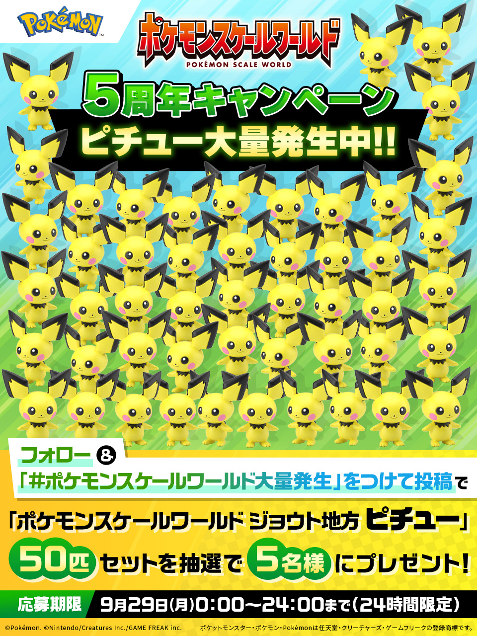 ●キャンペーン概要 ポケモン食玩【公式】@ポケモンキッズ/スケールワールドX(旧:Twitter)アカウント(@pokemonkids_of)をフォローのうえ、ハッシュタグ「#ポケモンスケールワールド大量発生」をつけて投稿していただいた方の中から抽選で「ポケモンスケールワールド ジョウト地方 ピチュー&トゲピー&エイパム」に収録の「ポケモンスケールワールド ジョウト地方 ピチュー」50匹を5名様にプレゼントいたします。 ●参加資格 利用規約に同意していただいた方 ●応募期間 2025年9月29日(月)0:00~9月29日(月)24:00 ●参加方法 STEP1:ご自身のアカウントでX(旧:Twitter)にログイン STEP2:ポケモン食玩【公式】@ポケモンキッズ/スケールワールドX(旧:Twitter)アカウント(@pokemonkids_of)をフォロー STEP3:以下の投稿ボタンよりハッシュタグ「#ポケモンスケールワールド大量発生」をつけて投稿 ※X(旧:Twitter)アカウントを非公開にしている場合、投稿を確認することができないため、本キャンペーンにはご参加いただけません。 ハッシュタグ「#ポケモンスケールワールド大量発生」をつけて投稿 ●賞品概要 抽選で5名様に「ポケモンスケールワールド ジョウト地方 ピチュー&トゲピー&エイパム」収録の「ポケモンスケールワールド ジョウト地方 ピチュー」を50匹 ●抽選発表 ご応募いただいた方の中から、厳正な抽選の上、当選者を決定いたします。 当選のご連絡は、2025年10月頃より順次、ポケモン食玩【公式】@ポケモンキッズ/スケールワールドX(旧:Twitter)アカウント(@pokemonkids_of)からダイレクトメッセージで行います。 ●賞品の発送 2025年10月頃の発送を予定しております。 ※交通事情・天候・お住まいの地域や配送状況、その他諸事情によりお届けが前後する場合がございます。予めご了承ください。 ●注意事項 ・X(旧:Twitter)アカウントを非公開にしている場合、投稿を確認することができないため、本キャンペーンにはご参加いただけません。 ・ポケモン食玩【公式】@ポケモンキッズ/スケールワールドX(旧:Twitter)アカウント(@pokemonkids_of)をフォローしていない場合や賞品の発送を行う前にフォローを解除した場合は応募無効となります。 ・アカウント作成後の所定の設定を行っていない場合やアカウント作成直後にフォロー又はハッシュタグポストした場合など、当選対象外になる可能性があります。 ・ご当選者の個人情報取得後に同一人物、同一世帯による重複当選が確認された場合は、一つのアカウントのみ有効としそれ以外は無効とさせていただきます。 ・賞品画像はイメージです。 ・プレゼントの当選はお一人様につき1回のみです。 ・連絡及び賞品発送に関して、事務局からご連絡をさせていただく場合がございます。 ・X Corp.(旧Twitter, Inc.)が提供するX(旧:Twitter)サービスの利用規約に違反する行為を行った場合は当選権を失効させていただきます。 ・X(旧:Twitter)が提供するサービスのメンテナンスや不具合が発生した場合など、X(旧:Twitter)へのログインが行えない、投稿ができないなどの状況が発生した場合は、本キャンペーンにご応募いただけない可能性がございます。 ・未成年者の方は、本キャンペーンに応募する際、保護者の同意を得てご応募してください。 ・本キャンペーンの応募状況および抽選結果に関するお問い合わせにはお答えいたしかねますので、あらかじめご了承ください。 ・賞品は、予告無く変更になる場合があります。 ・厳正な抽選のうえ、当選者を決定します。 ・ご当選の権利はご当選者様ご本人のものとなり、他の方への譲渡、転売、換金はできません。 ・ご応募は日本国内にお住まいの方に限らせていただきます。 ・お客様の住所、氏名等の情報を正しくご記載いただいていない場合や、転居により住所が変更になった場合、住所不明や長期不在等で賞品がお届けできない場合は、当選されても権利が無効となる場合がございますのでご注意ください。 ・交通事情、天候等で賞品の発送が遅れる場合がございます。予めご了承ください。 ・ご応募に際してのインターネット通信料接続料はお客様の負担となります。 ・通信の際の接続トラブルにつきましては、責任を負いかねますので、ご了承ください。 ・本キャンペーンは、やむを得ない事情により中止または内容が変更となる場合がございますので、あらかじめご了承ください。 ・当社社員および関係者は応募できません。 ・本キャンペーンは「X(旧:Twitter)」を活用したキャンペーンです。X(旧:Twitter)に関連するアプリケーションの動作環境により発生する本キャンペーン運営の中断または中止によって万一何らかの損害が発生したとしても、当社は一切責任を負いません。 ●個人情報の取り扱い 当選時に入力していただいた個人情報は、別途当社が定める「個人情報保護方針」に基づき、厳重に管理いたします。 ●お問い合わせ <バンダイ キャンディキャンペーンナビ> 電話番号 0570-082-315 受付時間 10時〜16時(土、日、祝日、夏季冬季休業日を除く)