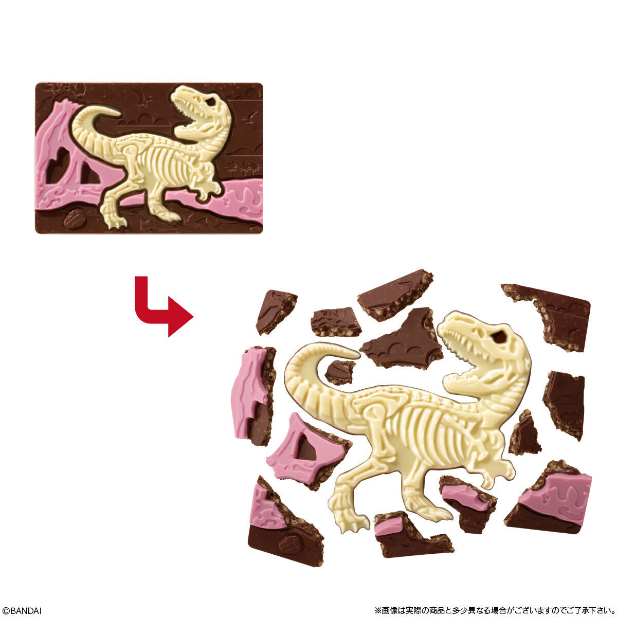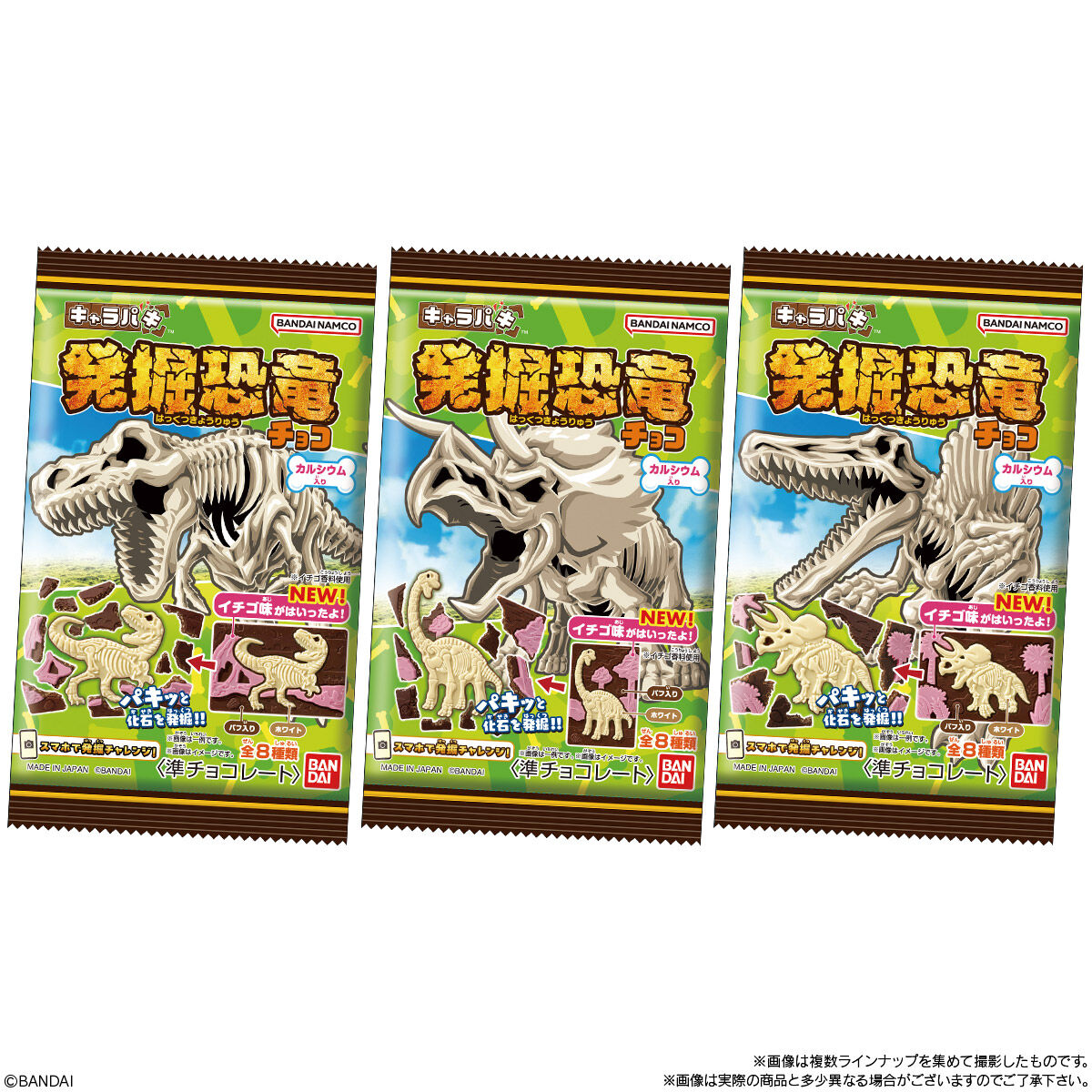 キャラパキ 発掘恐竜チョコ(2025年10月リニューアル) お気に入り お気に入り登録とは? 価格 120円(税込:130円) ※この商品は軽減税率8%対象商品です。 発売日 2025年10月6日 発売 売場 全国量販店の菓子売場等 商品アンケート 『化石』をデザインしたキャラパキ「発掘恐竜チョコ」が、なんと3色3味にパワーアップ!新たにイチゴ味が加わり、発掘の楽しさ・食べるおいしさも増しました! チョコデザインは全8種です。何が出てくるかはお楽しみ♪ 「キャラパキ」とは、パフ入りの板型チョコレートをパキパキ割って化石を型抜く、楽しい“遊び”要素が詰まったお菓子です。パフのサクサク食感と程よい香ばしさが後引く味わいです。 ●準チョコレート1個(全8種/うちシークレット1種)1.モササウルス2.スピノサウルス3.プテラノドン4.ブラキオサウルス5.ティラノサウルス 6.トリケラトプス7.ステゴサウルス8.シークレット (C)BANDAI ※画像には複数ラインナップを組み合わせて撮影したものも含まれます。 ※価格はメーカー希望小売価格表示です。 ※店頭での商品のお取り扱い開始日は、店舗によって異なる場合がございます。 ※画像は実際の商品とは多少異なる場合がございます。 ※掲載情報はページ公開時点のものです。予告なく変更になる場合がございます。