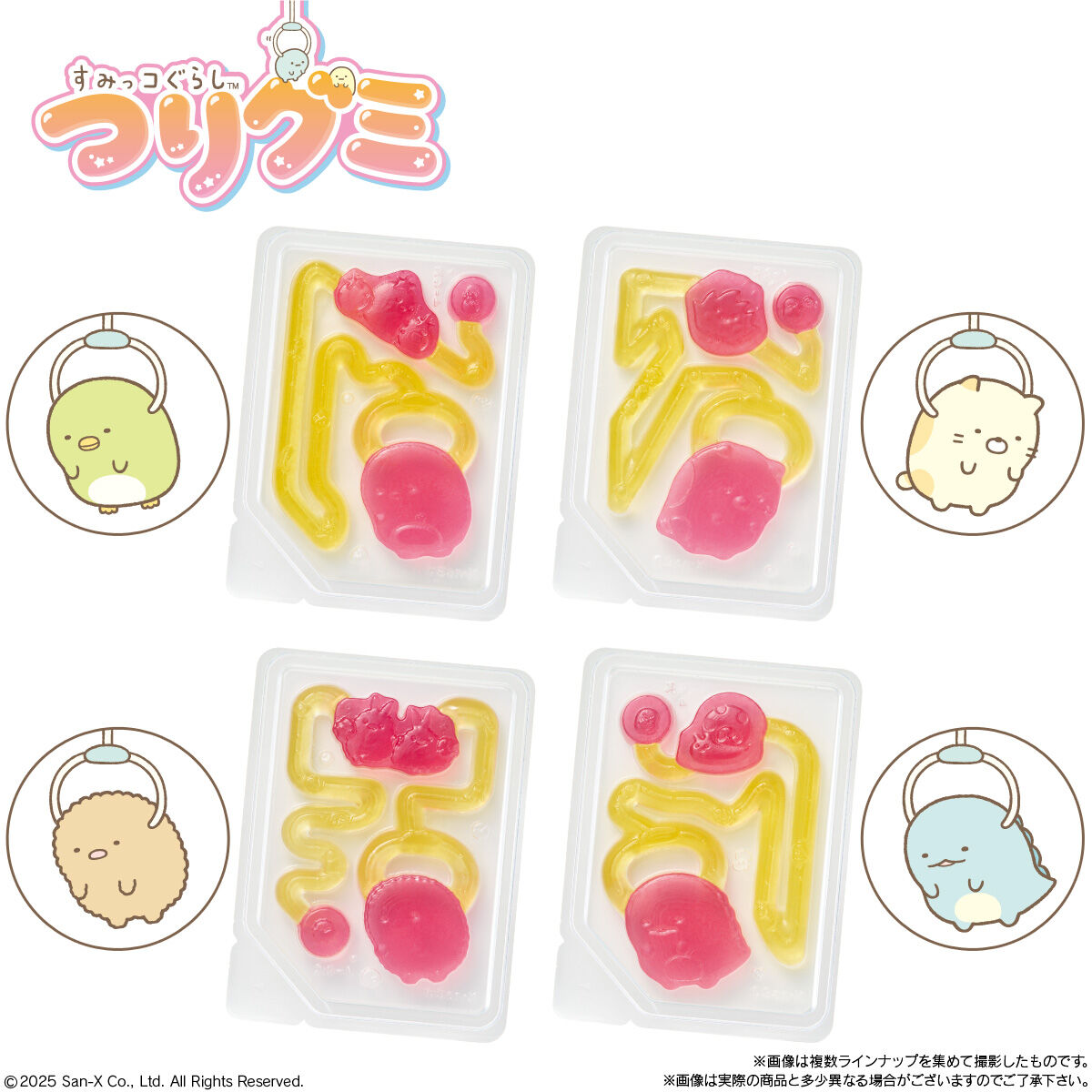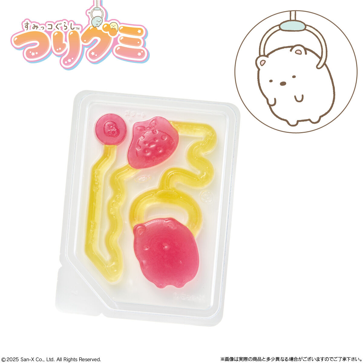 すみっコぐらし つりグミ(2025年11月リニューアル) お気に入り お気に入り登録とは? 価格 80円(税込:86円) ※この商品は軽減税率8%対象商品です。 発売日 2025年11月3日 発売 売場 全国量販店の菓子売場等 商品アンケート 「すみっコぐらし つりグミ」のパッケージデザインが新しくなってリニューアル!シークレットのデザインも含めてトレーデザインは人気の全14種です。味はぶどう味とオレンジ味の2味がひとつになっています! ●トレーグミ1枚(全14種/うちシークレット1種)1.しろくま×アーム2.ぺんぎん?×アーム3.とんかつ×アーム4.ねこ×アーム5.とかげ×アーム6.ぬいぐるみとガーランド7.かけっこ8.すみっコとうみっコ9.おすしの会10.にじのすべり台11.いっしょにおとまり会12.もぐらのおうち13.みんなあつまるんです14.シークレット (C)2025 San-X Co., Ltd. All Rights Reserved. ※画像には複数ラインナップを組み合わせて撮影したものも含まれます。 ※価格はメーカー希望小売価格表示です。 ※店頭での商品のお取り扱い開始日は、店舗によって異なる場合がございます。 ※画像は実際の商品とは多少異なる場合がございます。 ※掲載情報はページ公開時点のものです。予告なく変更になる場合がございます。