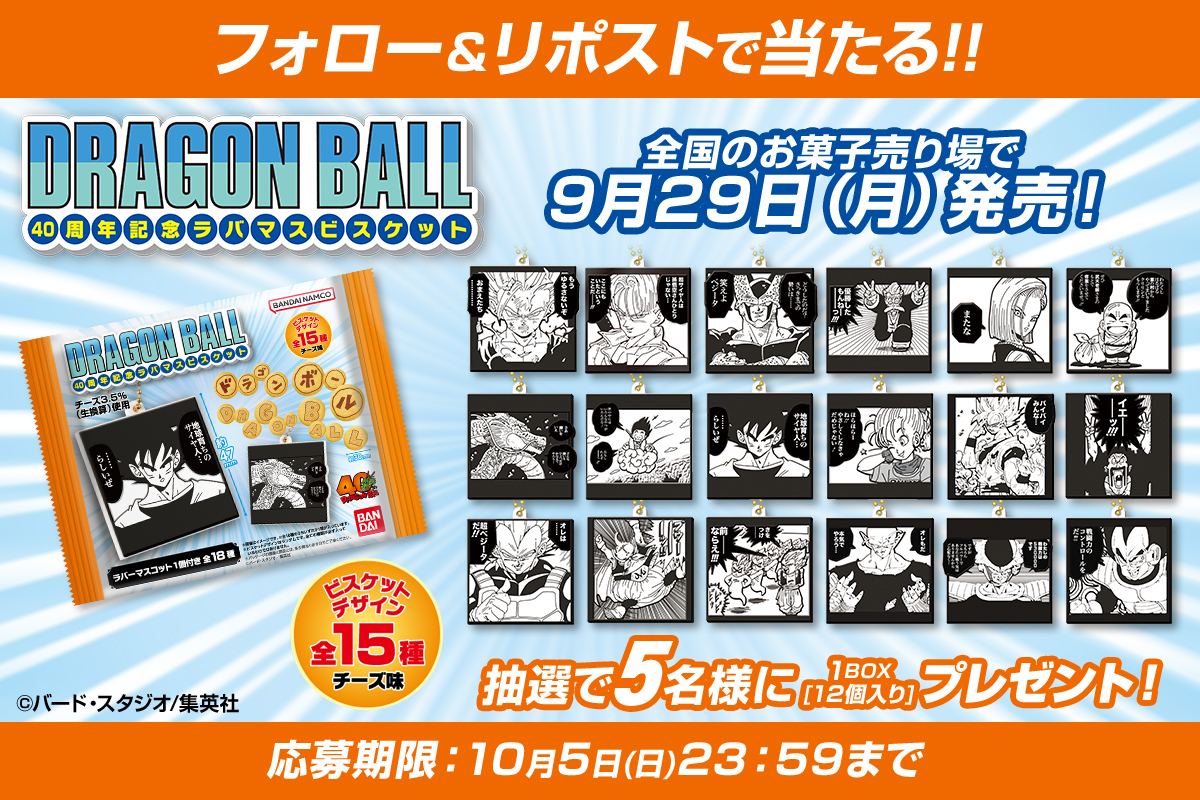 ●キャンペーン概要 バンダイ キャンディ公式X(旧:Twitter)アカウント(@candytoy_c)をフォローのうえ、対象の投稿をリポスト(リツイート)していただいた方の中から抽選で「ドラゴンボール40周年記念 ラバマスビスケット」1箱(10個入り)を5名様にプレゼントいたします。 ●参加資格 利用規約に同意していただいた方 ●応募期間 2025年9月26日(金)~10月5日(日)23:59 ●参加方法 STEP1:ご自身のアカウントでX(旧:Twitter)にログイン STEP2:バンダイ キャンディ公式X(旧:Twitter)アカウント(@candytoy_c)をフォロー STEP3:対象の投稿をリポスト(リツイート) ※X(旧:Twitter)アカウントを非公開にしている場合、投稿を確認することができないため、本キャンペーンにはご参加いただけません。 ●賞品概要 抽選で5名様に「ドラゴンボール40周年記念 ラバマスビスケット」1箱(10個入り) ●抽選発表 ご応募いただいた方の中から、厳正な抽選の上、当選者を決定いたします。 当選のご連絡は、2025年10月頃より順次、バンダイ キャンディ公式X(旧:Twitter)アカウント(@candytoy_c)からダイレクトメッセージで行います。 ●賞品の発送 2025年10月頃の発送を予定しております。 ※交通事情・天候・お住まいの地域や配送状況、その他諸事情によりお届けが前後する場合がございます。予めご了承ください。 ●注意事項 ・X(旧:Twitter)アカウントを非公開にしている場合、投稿を確認することができないため、本キャンペーンにはご参加いただけません。 ・バンダイ キャンディ公式X(旧:Twitter)アカウント(@candytoy_c)をフォローしていない場合や当選連絡を行う前にフォローを解除した場合は応募無効となります。 ・アカウント作成後の所定の設定を行っていない場合やアカウント作成直後にフォロー又はリポスト(リツイート)した場合など、当選対象外になる可能性があります。 ・ご当選者の個人情報取得後に同一人物、同一世帯による重複当選が確認された場合は、一つのアカウントのみ有効としそれ以外は無効とさせていただきます。 ・賞品画像はイメージです。 ・プレゼントの当選はお一人様につき1回のみです。 ・連絡及び賞品発送に関して、事務局からご連絡をさせていただく場合がございます。 ・X Corp.(旧Twitter, Inc.)が提供するX(旧:Twitter)サービスの利用規約に違反する行為を行った場合は当選権を失効させていただきます。 ・X(旧:Twitter)が提供するサービスのメンテナンスや不具合が発生した場合など、X(旧:Twitter)へのログインが行えない、投稿ができないなどの状況が発生した場合は、本キャンペーンにご応募いただけない可能性がございます。 ・未成年者の方は、本キャンペーンに応募する際、保護者の同意を得てご応募してください。 ・本キャンペーンの応募状況および抽選結果に関するお問い合わせにはお答えいたしかねますので、あらかじめご了承ください。 ・賞品は、予告無く変更になる場合があります。 ・厳正な抽選のうえ、当選者を決定します。 ・ご当選の権利はご当選者様ご本人のものとなり、他の方への譲渡、転売、換金はできません。 ・ご応募は日本国内にお住まいの方に限らせていただきます。 ・お客様の住所、氏名等の情報を正しくご記載いただいていない場合や、転居により住所が変更になった場合、住所不明や長期不在等で賞品がお届けできない場合は、当選されても権利が無効となる場合がございますのでご注意ください。 ・交通事情、天候等で賞品の発送が遅れる場合がございます。予めご了承ください。 ・ご応募に際してのインターネット通信料接続料はお客様の負担となります。 ・通信の際の接続トラブルにつきましては、責任を負いかねますので、ご了承ください。 ・本キャンペーンは、やむを得ない事情により中止または内容が変更となる場合がございますので、あらかじめご了承ください。 ・当社社員および関係者は応募できません。 ・本キャンペーンは「X(旧:Twitter)」を活用したキャンペーンです。X(旧:Twitter)に関連するアプリケーションの動作環境により発生する本キャンペーン運営の中断または中止によって万一何らかの損害が発生したとしても、当社は一切責任を負いません。 ●個人情報の取り扱い 当選時に入力していただいた個人情報は、別途当社が定める「個人情報保護方針」に基づき、厳重に管理いたします。 ●お問い合わせ <バンダイ キャンディキャンペーンナビ> 電話番号 0570-082-315 受付時間 10時〜16時(土、日、祝日、夏季冬季休業日を除く)