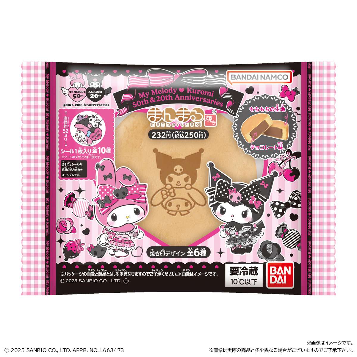 マイメロディ&クロミ まんまる焼き お気に入り お気に入り登録とは? 価格 232円(税込:250円) ※この商品は軽減税率8%対象商品です。 発売日 2025年10月25日 発売 売場 全国のセブン-イレブン(一部店舗を除く)のチルドスイーツコーナー 対象年齢 3才以上 商品アンケート それぞれ50周年と20周年を迎えるマイメロディ&クロミのまんまる焼きが登場! まんまる生地の今川焼きに焼き印(全6種)が押されており、中にはチョコレート味のクリームが入っているスイーツです。 付属のシールは全10種の中からランダムで1枚が入っています。 セブン-イレブン限定発売です。 ●和生菓子1個(焼き印全6種) ●シール1枚入り(全10種) (C) 2025 SANRIO CO., LTD. APPR. NO. L663473 ※画像には複数ラインナップを組み合わせて撮影したものも含まれます。 ※価格はメーカー希望小売価格表示です。 ※店頭での商品のお取り扱い開始日は、店舗によって異なる場合がございます。 ※画像は実際の商品とは多少異なる場合がございます。 ※掲載情報はページ公開時点のものです。予告なく変更になる場合がございます。 ※開封後は消費期限にかかわらず、お早めに召し上がってください。 ※生地の黒い斑点は焦げです。品質に問題はございません。 ※クリームが生地の表面についていることがありますが、品質に問題はございません。 ※召し上がり方 冷蔵庫で冷やして、そのまま召し上がってください。