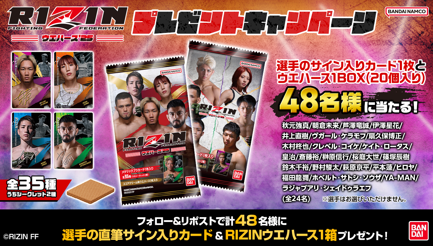 ●キャンペーン概要 バンダイ キャンディ公式X(旧:Twitter)アカウント(@candytoy_c)をフォローのうえ、対象の投稿をリポスト(リツイート)していただいた方の中から抽選で「RIZINウエハース'25」1箱(20個入り)と「選手の直筆サイン入りカード」1枚のセットを48名様にプレゼントいたします。 ●参加資格 利用規約に同意していただいた方 ●応募期間 2025年11月28日(金)~12月7日(日)23:59 ●参加方法 STEP1:ご自身のアカウントでX(旧:Twitter)にログイン STEP2:バンダイ キャンディ公式X(旧:Twitter)アカウント(@candytoy_c)をフォロー STEP3:対象の投稿をリポスト(リツイート) ※X(旧:Twitter)アカウントを非公開にしている場合、投稿を確認することができないため、本キャンペーンにはご参加いただけません。 ●賞品概要 抽選で48名様に「RIZINウエハース'25」1箱(20個入り)と「選手の直筆サイン入りカード」1枚のセット※選手はお選びいただけません。 ●抽選発表 ご応募いただいた方の中から、厳正な抽選の上、当選者を決定いたします。 当選のご連絡は、2025年12月頃より順次、バンダイ キャンディ公式X(旧:Twitter)アカウント(@candytoy_c)からダイレクトメッセージで行います。 ●賞品の発送 2025年12月頃の発送を予定しております。 ※交通事情・天候・お住まいの地域や配送状況、その他諸事情によりお届けが前後する場合がございます。予めご了承ください。 ●注意事項 ・X(旧:Twitter)アカウントを非公開にしている場合、投稿を確認することができないため、本キャンペーンにはご参加いただけません。 ・バンダイ キャンディ公式X(旧:Twitter)アカウント(@candytoy_c)をフォローしていない場合や当選連絡を行う前にフォローを解除した場合は応募無効となります。 ・アカウント作成後の所定の設定を行っていない場合やアカウント作成直後にフォロー又はリポスト(リツイート)した場合など、当選対象外になる可能性があります。 ・ご当選者の個人情報取得後に同一人物、同一世帯による重複当選が確認された場合は、一つのアカウントのみ有効としそれ以外は無効とさせていただきます。 ・賞品画像はイメージです。 ・プレゼントの当選はお一人様につき1回のみです。 ・連絡及び賞品発送に関して、事務局からご連絡をさせていただく場合がございます。 ・X Corp.(旧Twitter, Inc.)が提供するX(旧:Twitter)サービスの利用規約に違反する行為を行った場合は当選権を失効させていただきます。 ・X(旧:Twitter)が提供するサービスのメンテナンスや不具合が発生した場合など、X(旧:Twitter)へのログインが行えない、投稿ができないなどの状況が発生した場合は、本キャンペーンにご応募いただけない可能性がございます。 ・未成年者の方は、本キャンペーンに応募する際、保護者の同意を得てご応募してください。 ・本キャンペーンの応募状況および抽選結果に関するお問い合わせにはお答えいたしかねますので、あらかじめご了承ください。 ・賞品は、予告無く変更になる場合があります。 ・厳正な抽選のうえ、当選者を決定します。 ・ご当選の権利はご当選者様ご本人のものとなり、他の方への譲渡、転売、換金はできません。 ・ご応募は日本国内にお住まいの方に限らせていただきます。 ・お客様の住所、氏名等の情報を正しくご記載いただいていない場合や、転居により住所が変更になった場合、住所不明や長期不在等で賞品がお届けできない場合は、当選されても権利が無効となる場合がございますのでご注意ください。 ・交通事情、天候等で賞品の発送が遅れる場合がございます。予めご了承ください。 ・ご応募に際してのインターネット通信料接続料はお客様の負担となります。 ・通信の際の接続トラブルにつきましては、責任を負いかねますので、ご了承ください。 ・本キャンペーンは、やむを得ない事情により中止または内容が変更となる場合がございますので、あらかじめご了承ください。 ・当社社員および関係者は応募できません。 ・本キャンペーンは「X(旧:Twitter)」を活用したキャンペーンです。X(旧:Twitter)に関連するアプリケーションの動作環境により発生する本キャンペーン運営の中断または中止によって万一何らかの損害が発生したとしても、当社は一切責任を負いません。 ●個人情報の取り扱い 当選時に入力していただいた個人情報は、別途当社が定める「個人情報保護方針」に基づき、厳重に管理いたします。 ●お問い合わせ <バンダイ キャンディキャンペーンナビ> 電話番号 0570-082-315 受付時間 10時〜16時(土、日、祝日、夏季冬季休業日を除く)
