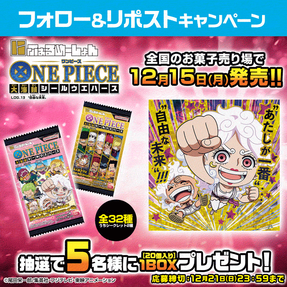 ●キャンペーン概要 バンダイ キャンディ公式X(旧:Twitter)アカウント(@candytoy_c)をフォローのうえ、対象の投稿をリポスト(リツイート)していただいた方の中から抽選で「にふぉるめーしょん ワンピース大海賊シールウエハースLOG.13」1箱(20個入り)を5名様にプレゼントいたします。 ●参加資格 利用規約に同意していただいた方 ●応募期間 2025年12月12日(金)~12月19日(金)23:59 ●参加方法 STEP1:ご自身のアカウントでX(旧:Twitter)にログイン STEP2:バンダイ キャンディ公式X(旧:Twitter)アカウント(@candytoy_c)をフォロー STEP3:対象の投稿をリポスト(リツイート) ※X(旧:Twitter)アカウントを非公開にしている場合、投稿を確認することができないため、本キャンペーンにはご参加いただけません。 ●賞品概要 抽選で5名様に「にふぉるめーしょん ワンピース大海賊シールウエハースLOG.13」1箱(20個入り) ●抽選発表 ご応募いただいた方の中から、厳正な抽選の上、当選者を決定いたします。 当選のご連絡は、2025年12月頃より順次、バンダイ キャンディ公式X(旧:Twitter)アカウント(@candytoy_c)からダイレクトメッセージで行います。 ●賞品の発送 2026年1月頃の発送を予定しております。 ※交通事情・天候・お住まいの地域や配送状況、その他諸事情によりお届けが前後する場合がございます。予めご了承ください。 ●注意事項 ・X(旧:Twitter)アカウントを非公開にしている場合、投稿を確認することができないため、本キャンペーンにはご参加いただけません。 ・バンダイ キャンディ公式X(旧:Twitter)アカウント(@candytoy_c)をフォローしていない場合や当選連絡を行う前にフォローを解除した場合は応募無効となります。 ・アカウント作成後の所定の設定を行っていない場合やアカウント作成直後にフォロー又はリポスト(リツイート)した場合など、当選対象外になる可能性があります。 ・ご当選者の個人情報取得後に同一人物、同一世帯による重複当選が確認された場合は、一つのアカウントのみ有効としそれ以外は無効とさせていただきます。 ・賞品画像はイメージです。 ・プレゼントの当選はお一人様につき1回のみです。 ・連絡及び賞品発送に関して、事務局からご連絡をさせていただく場合がございます。 ・X Corp.(旧Twitter, Inc.)が提供するX(旧:Twitter)サービスの利用規約に違反する行為を行った場合は当選権を失効させていただきます。 ・X(旧:Twitter)が提供するサービスのメンテナンスや不具合が発生した場合など、X(旧:Twitter)へのログインが行えない、投稿ができないなどの状況が発生した場合は、本キャンペーンにご応募いただけない可能性がございます。 ・未成年者の方は、本キャンペーンに応募する際、保護者の同意を得てご応募してください。 ・本キャンペーンの応募状況および抽選結果に関するお問い合わせにはお答えいたしかねますので、あらかじめご了承ください。 ・賞品は、予告無く変更になる場合があります。 ・厳正な抽選のうえ、当選者を決定します。 ・ご当選の権利はご当選者様ご本人のものとなり、他の方への譲渡、転売、換金はできません。 ・ご応募は日本国内にお住まいの方に限らせていただきます。 ・お客様の住所、氏名等の情報を正しくご記載いただいていない場合や、転居により住所が変更になった場合、住所不明や長期不在等で賞品がお届けできない場合は、当選されても権利が無効となる場合がございますのでご注意ください。 ・交通事情、天候等で賞品の発送が遅れる場合がございます。予めご了承ください。 ・ご応募に際してのインターネット通信料接続料はお客様の負担となります。 ・通信の際の接続トラブルにつきましては、責任を負いかねますので、ご了承ください。 ・本キャンペーンは、やむを得ない事情により中止または内容が変更となる場合がございますので、あらかじめご了承ください。 ・当社社員および関係者は応募できません。 ・本キャンペーンは「X(旧:Twitter)」を活用したキャンペーンです。X(旧:Twitter)に関連するアプリケーションの動作環境により発生する本キャンペーン運営の中断または中止によって万一何らかの損害が発生したとしても、当社は一切責任を負いません。 ●個人情報の取り扱い 当選時に入力していただいた個人情報は、別途当社が定める「個人情報保護方針」に基づき、厳重に管理いたします。 ●お問い合わせ <バンダイ キャンディキャンペーンナビ> 電話番号 0570-082-315 受付時間 10時〜16時(土、日、祝日、夏季冬季休業日を除く)