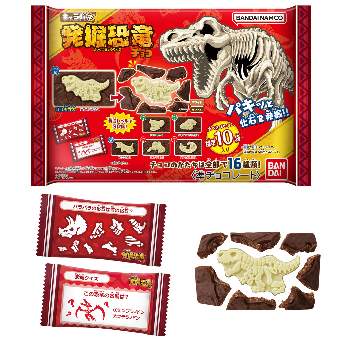 キャラパキ発掘恐竜チョコ 大袋 期間限定パッケージver. お気に入り お気に入り登録とは? 価格 358円(税込:387円) ※この商品は軽減税率8%対象商品です。 発売日 2025年12月22日 発売 売場 全国量販店の菓子売場等 商品アンケート 『化石』をデザインしたキャラパキ「発掘恐竜チョコ」の大袋から期間限定パッケージが登場!みんなでわけて・割って・楽しい・おいしい、お得なファミリーパックです!「キャラパキ」とは、板型チョコレートをパキパキ割って化石を型抜く、楽しい“遊び”要素が詰まったお菓子です。チョコのデザインは全16種類でどれが出てくるかはお楽しみです。 ●準チョコレート 10袋(全16種) (C)BANDAI ※画像には複数ラインナップを組み合わせて撮影したものも含まれます。 ※価格はメーカー希望小売価格表示です。 ※店頭での商品のお取り扱い開始日は、店舗によって異なる場合がございます。 ※画像は実際の商品とは多少異なる場合がございます。 ※掲載情報はページ公開時点のものです。予告なく変更になる場合がございます。