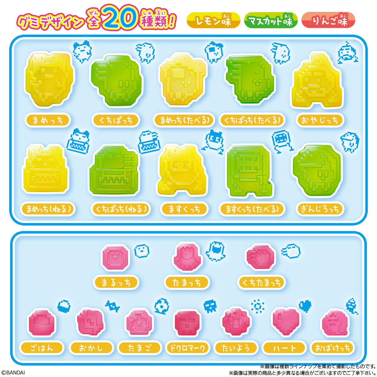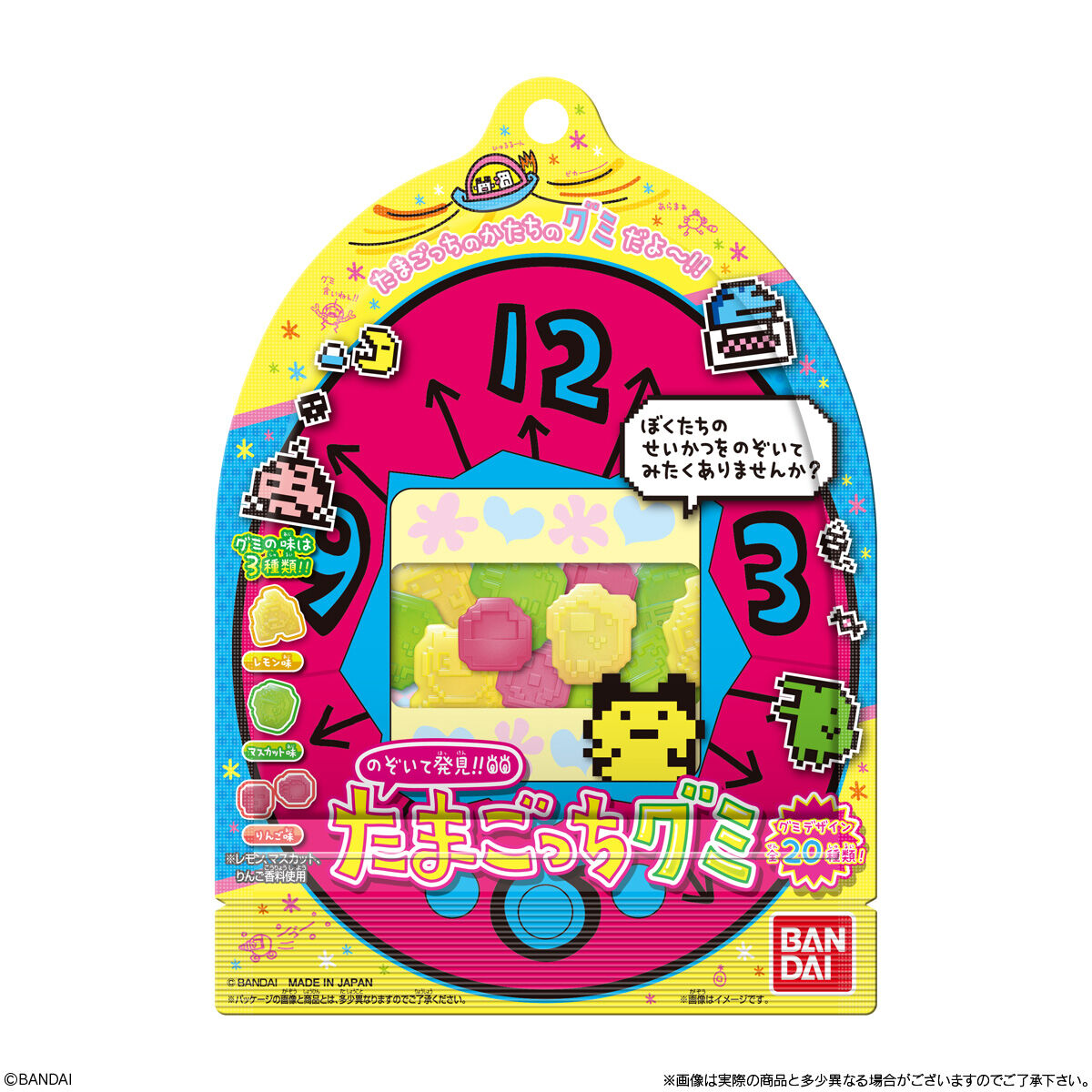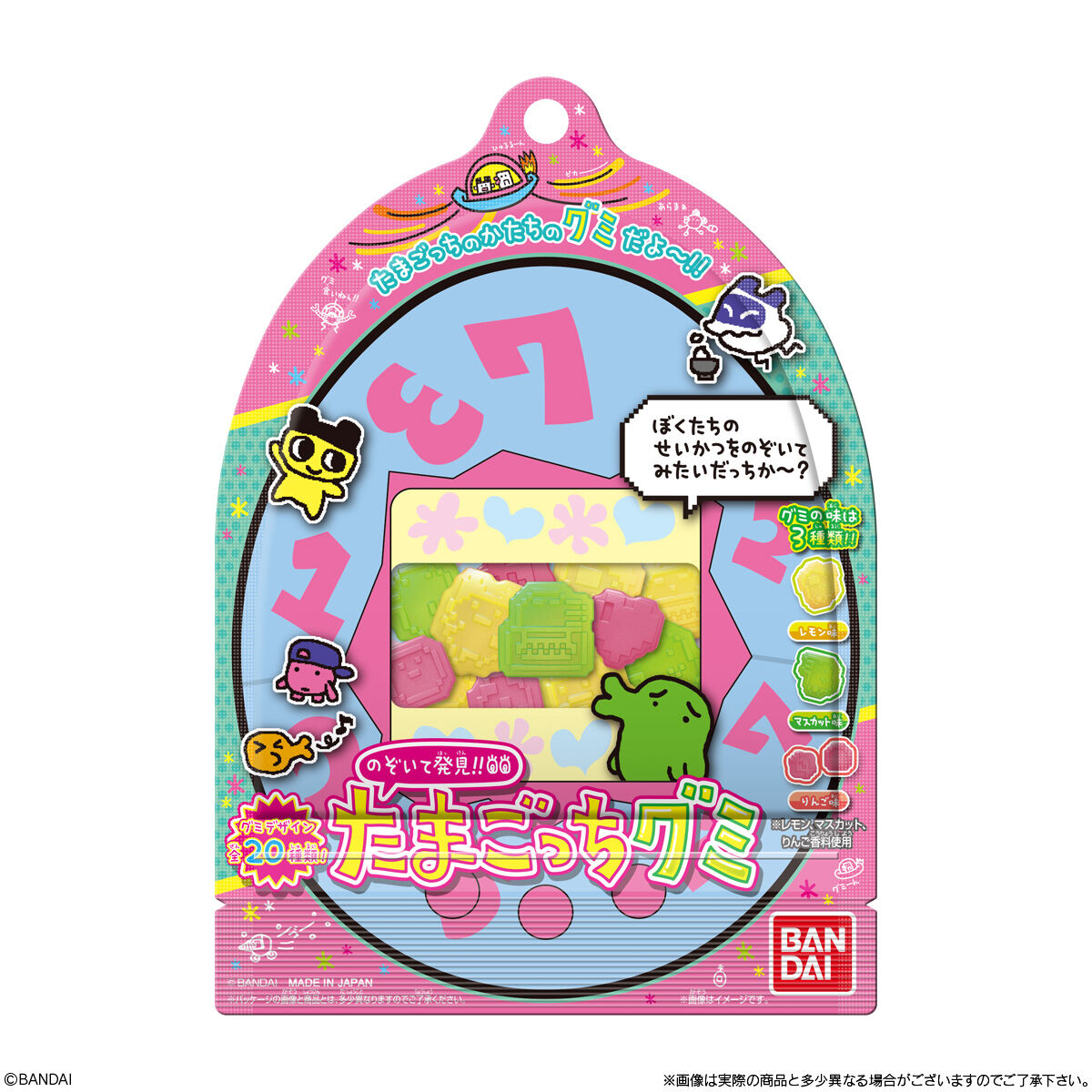 のぞいて発見!! たまごっちグミ お気に入り お気に入り登録とは? 価格 180円(税込:194円) ※この商品は軽減税率8%対象商品です。 発売日 2025年11月17日 発売 売場 全国量販店の菓子売場等 商品アンケート たまごっちたちの生活をのぞけちゃう!?パッケージが初代たまごっちの筐体デザインになっていて透明になっている液晶画面部分から中に入っているグミ(たまごっちたち)が見える!初代たまごっちに登場するたまごっちたちに加えて、ごはんやアイテムの小粒グミも含めたグミラインナップは全20種!!グミでたまごっちたちの生活の様子を再現できちゃいます!食べ進めることでオリジナルのシーンを作り出すことができて、持ち運びも楽しい♪味はマスカット味、レモン味、りんご味の3色のカラフルグミです。 「Tamagotchi Paradise(たまごっちパラダイス)」(別売り)で使えるショップコードつき! ●グミキャンディ40g(全20種)1.まめっち2.くちぱっち3.まめっち(たべる)4.くちぱっち(たべる)5.おやじっち6.まめっち(ねる)7.くちぱっち(ねる)8.ますくっち9.ますくっち(たべる)10.ぎんじろっち11.まるっち12.たまっち13.くちたまっち14.ごはん15.おかし16.たまご17.ドクロマーク18.たいよう19.ハート20.おばけっち (C)BANDAI ※画像には複数ラインナップを組み合わせて撮影したものも含まれます。 ※価格はメーカー希望小売価格表示です。 ※店頭での商品のお取り扱い開始日は、店舗によって異なる場合がございます。 ※画像は実際の商品とは多少異なる場合がございます。 ※掲載情報はページ公開時点のものです。予告なく変更になる場合がございます。
