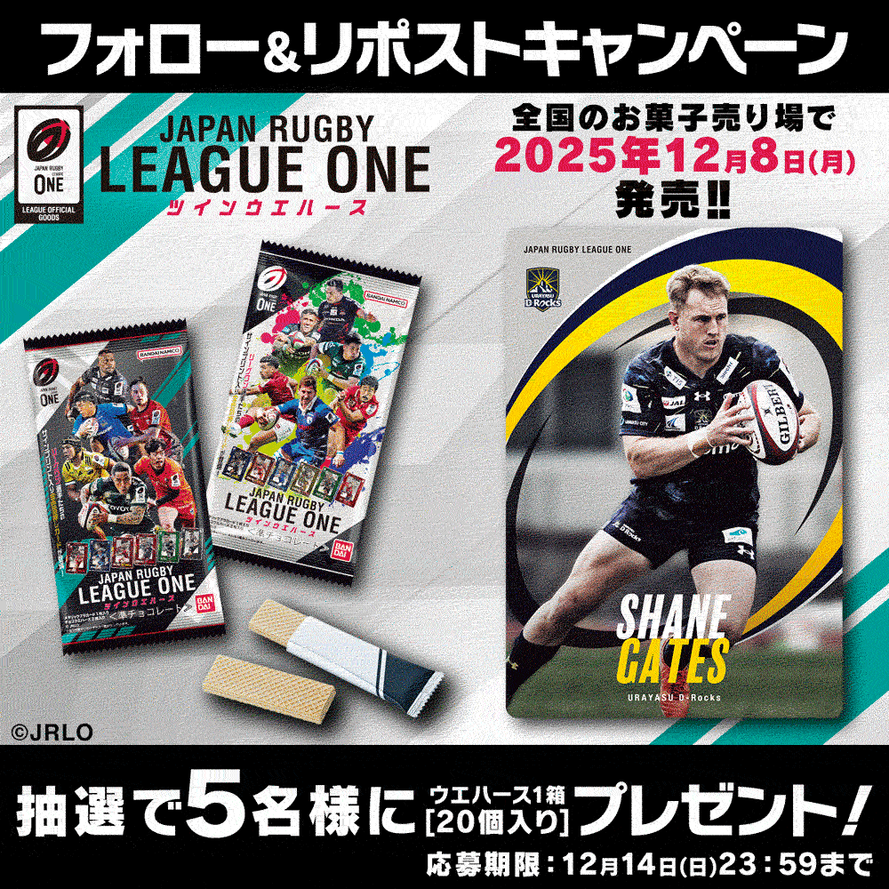 ●キャンペーン概要 バンダイ キャンディ公式X(旧:Twitter)アカウント(@candytoy_c)をフォローのうえ、対象の投稿をリポスト(リツイート)していただいた方の中から抽選で「JAPAN RUGBY LEAGUE ONE ツインウエハース」1箱(20個入り)を5名様にプレゼントいたします。 ●参加資格 利用規約に同意していただいた方 ●応募期間 2025年12月5日(金)~12月14日(日)23:59 ●参加方法 STEP1:ご自身のアカウントでX(旧:Twitter)にログイン STEP2:バンダイ キャンディ公式X(旧:Twitter)アカウント(@candytoy_c)をフォロー STEP3:対象の投稿をリポスト(リツイート) ※X(旧:Twitter)アカウントを非公開にしている場合、投稿を確認することができないため、本キャンペーンにはご参加いただけません。 ●賞品概要 抽選で5名様に「JAPAN RUGBY LEAGUE ONE ツインウエハース」1箱(20個入り) ●抽選発表 ご応募いただいた方の中から、厳正な抽選の上、当選者を決定いたします。 当選のご連絡は、2025年12月頃より順次、バンダイ キャンディ公式X(旧:Twitter)アカウント(@candytoy_c)からダイレクトメッセージで行います。 ●賞品の発送 2025年12月頃の発送を予定しております。 ※交通事情・天候・お住まいの地域や配送状況、その他諸事情によりお届けが前後する場合がございます。予めご了承ください。 ●注意事項 ・X(旧:Twitter)アカウントを非公開にしている場合、投稿を確認することができないため、本キャンペーンにはご参加いただけません。 ・バンダイ キャンディ公式X(旧:Twitter)アカウント(@candytoy_c)をフォローしていない場合や当選連絡を行う前にフォローを解除した場合は応募無効となります。 ・アカウント作成後の所定の設定を行っていない場合やアカウント作成直後にフォロー又はリポスト(リツイート)した場合など、当選対象外になる可能性があります。 ・ご当選者の個人情報取得後に同一人物、同一世帯による重複当選が確認された場合は、一つのアカウントのみ有効としそれ以外は無効とさせていただきます。 ・賞品画像はイメージです。 ・プレゼントの当選はお一人様につき1回のみです。 ・連絡及び賞品発送に関して、事務局からご連絡をさせていただく場合がございます。 ・X Corp.(旧Twitter, Inc.)が提供するX(旧:Twitter)サービスの利用規約に違反する行為を行った場合は当選権を失効させていただきます。 ・X(旧:Twitter)が提供するサービスのメンテナンスや不具合が発生した場合など、X(旧:Twitter)へのログインが行えない、投稿ができないなどの状況が発生した場合は、本キャンペーンにご応募いただけない可能性がございます。 ・未成年者の方は、本キャンペーンに応募する際、保護者の同意を得てご応募してください。 ・本キャンペーンの応募状況および抽選結果に関するお問い合わせにはお答えいたしかねますので、あらかじめご了承ください。 ・賞品は、予告無く変更になる場合があります。 ・厳正な抽選のうえ、当選者を決定します。 ・ご当選の権利はご当選者様ご本人のものとなり、他の方への譲渡、転売、換金はできません。 ・ご応募は日本国内にお住まいの方に限らせていただきます。 ・お客様の住所、氏名等の情報を正しくご記載いただいていない場合や、転居により住所が変更になった場合、住所不明や長期不在等で賞品がお届けできない場合は、当選されても権利が無効となる場合がございますのでご注意ください。 ・交通事情、天候等で賞品の発送が遅れる場合がございます。予めご了承ください。 ・ご応募に際してのインターネット通信料接続料はお客様の負担となります。 ・通信の際の接続トラブルにつきましては、責任を負いかねますので、ご了承ください。 ・本キャンペーンは、やむを得ない事情により中止または内容が変更となる場合がございますので、あらかじめご了承ください。 ・当社社員および関係者は応募できません。 ・本キャンペーンは「X(旧:Twitter)」を活用したキャンペーンです。X(旧:Twitter)に関連するアプリケーションの動作環境により発生する本キャンペーン運営の中断または中止によって万一何らかの損害が発生したとしても、当社は一切責任を負いません。 ●個人情報の取り扱い 当選時に入力していただいた個人情報は、別途当社が定める「個人情報保護方針」に基づき、厳重に管理いたします。 ●お問い合わせ <バンダイ キャンディキャンペーンナビ> 電話番号 0570-082-315 受付時間 10時〜16時(土、日、祝日、夏季冬季休業日を除く)