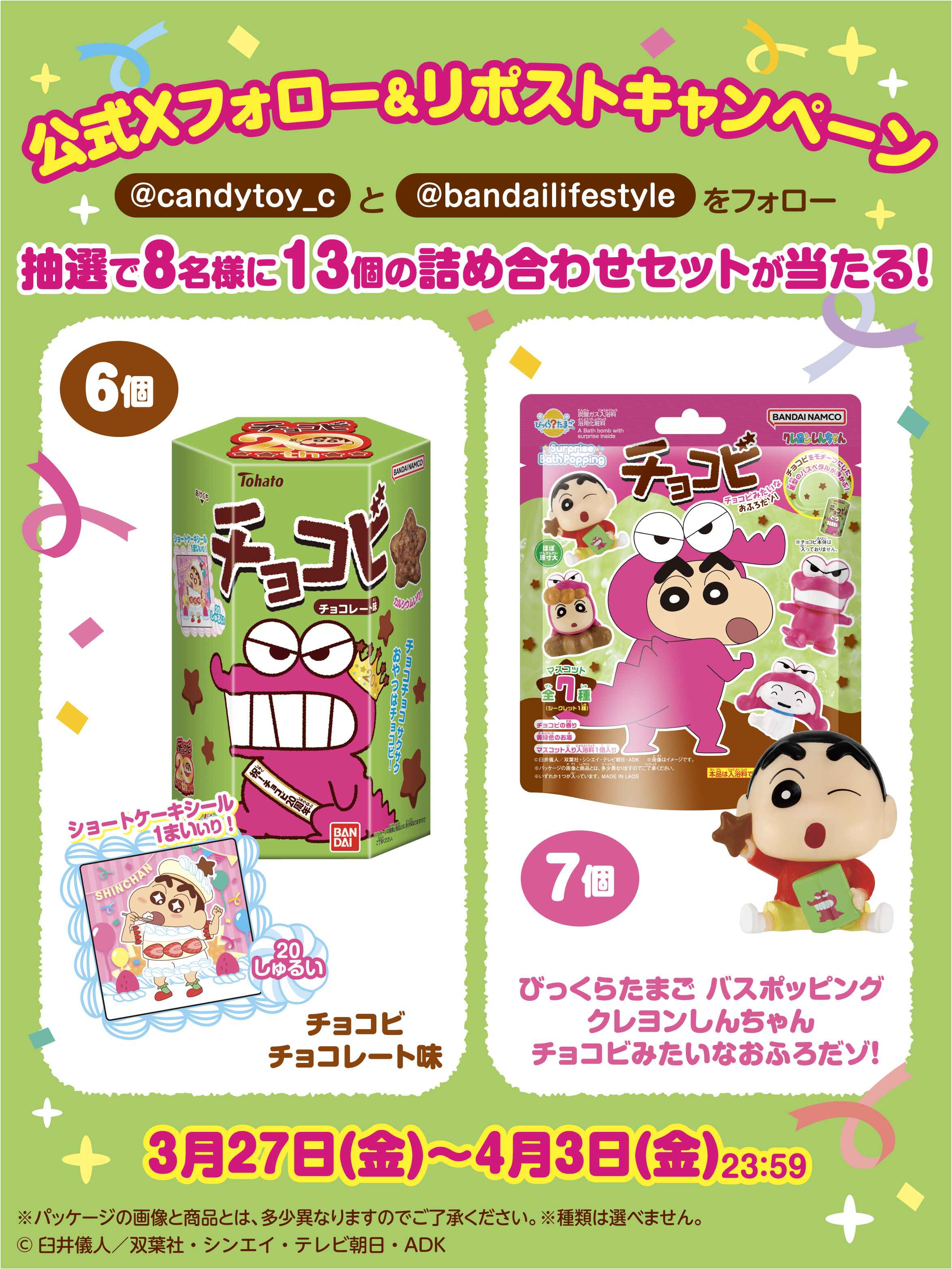 ●キャンペーン概要 バンダイ キャンディ公式X(旧:Twitter)アカウント(@candytoy_c)とライフスタイルバンダイ【公式】X(旧:Twitter)アカウント(@bandailifestyle)をフォローのうえ、対象の投稿をリポスト(リツイート)していただいた方の中から抽選で「チョコビ チョコレート味(2026年3月リニューアル)」6個と「びっくらたまご バスポッピング クレヨンしんちゃん チョコビみたいなおふろだゾ!」7個のセットを8名様にプレゼントいたします。 ●参加資格 利用規約に同意していただいた方 ●応募期間 2026年3月27日(金)~4月3日(金)23:59 ●応募方法 STEP1:ご自身のアカウントでX(旧:Twitter)にログイン STEP2:バンダイ キャンディ公式X(旧:Twitter)アカウント(@candytoy_c)とライフスタイルバンダイ【公式】X(旧:Twitter)アカウント(@bandailifestyle)をフォロー STEP3:対象の投稿をリポスト(リツイート) ※X(旧:Twitter)アカウントを非公開にしている場合、投稿を確認することができないため、本キャンペーンにはご参加いただけません。 ●賞品概要 抽選で8名様に「チョコビ チョコレート味(2026年3月リニューアル)」6個と「びっくらたまご バスポッピング クレヨンしんちゃん チョコビみたいなおふろだゾ!」7個のセット ●抽選発表 ご応募いただいた方の中から、厳正な抽選の上、当選者を決定いたします。 当選のご連絡は、2026年4月頃より順次、バンダイ キャンディ公式X(旧:Twitter)アカウント(@candytoy_c)からダイレクトメッセージで行います。 ●賞品の発送 2026年4月頃の発送を予定しております。 ※交通事情・天候・お住まいの地域や配送状況、その他諸事情によりお届けが前後する場合がございます。予めご了承ください。 ●注意事項 ・X(旧:Twitter)アカウントを非公開にしている場合、投稿を確認することができないため、本キャンペーンにはご参加いただけません。 ・バンダイ キャンディ公式X(旧:Twitter)アカウント(@candytoy_c)とライフスタイルバンダイ【公式】X(旧:Twitter)アカウント(@bandailifestyle)をフォローしていない場合や当選連絡を行う前にフォローを解除した場合は応募無効となります。 ・アカウント作成後の所定の設定を行っていない場合やアカウント作成直後にフォロー又はリポスト(リツイート)した場合など、当選対象外になる可能性があります。 ・ご当選者の個人情報取得後に同一人物、同一世帯による重複当選が確認された場合は、一つのアカウントのみ有効としそれ以外は無効とさせていただきます。 ・賞品画像はイメージです。 ・プレゼントの当選はお一人様につき1回のみです。 ・連絡及び賞品発送に関して、事務局からご連絡をさせていただく場合がございます。 ・X Corp.(旧Twitter, Inc.)が提供するX(旧:Twitter)サービスの利用規約に違反する行為を行った場合は当選権を失効させていただきます。 ・X(旧:Twitter)が提供するサービスのメンテナンスや不具合が発生した場合など、X(旧:Twitter)へのログインが行えない、投稿ができないなどの状況が発生した場合は、本キャンペーンにご応募いただけない可能性がございます。 ・未成年者の方は、本キャンペーンに応募する際、保護者の同意を得てご応募してください。 ・本キャンペーンの応募状況および抽選結果に関するお問い合わせにはお答えいたしかねますので、あらかじめご了承ください。 ・賞品は、予告無く変更になる場合があります。 ・厳正な抽選のうえ、当選者を決定します。 ・ご当選の権利はご当選者様ご本人のものとなり、他の方への譲渡、転売、換金はできません。 ・ご応募は日本国内にお住まいの方に限らせていただきます。 ・お客様の住所、氏名等の情報を正しくご記載いただいていない場合や、転居により住所が変更になった場合、住所不明や長期不在等で賞品がお届けできない場合は、当選されても権利が無効となる場合がございますのでご注意ください。 ・交通事情、天候等で賞品の発送が遅れる場合がございます。予めご了承ください。 ・ご応募に際してのインターネット通信料接続料はお客様の負担となります。 ・通信の際の接続トラブルにつきましては、責任を負いかねますので、ご了承ください。 ・本キャンペーンは、やむを得ない事情により中止または内容が変更となる場合がございますので、あらかじめご了承ください。 ・当社社員および関係者は応募できません。 ・本キャンペーンは「X(旧:Twitter)」を活用したキャンペーンです。X(旧:Twitter)に関連するアプリケーションの動作環境により発生する本キャンペーン運営の中断または中止によって万一何らかの損害が発生したとしても、当社は一切責任を負いません。 ●個人情報の取り扱い 当選時に入力していただいた個人情報は、別途当社が定める「個人情報保護方針」に基づき、厳重に管理いたします。 ●お問い合わせ <バンダイ キャンディキャンペーンナビ> 電話番号 0570-082-315 受付時間 10時〜16時(土、日、祝日、夏季冬季休業日を除く)