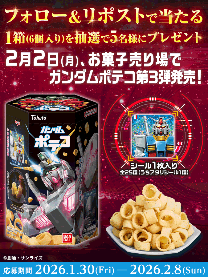 ●キャンペーン概要 バンダイ キャンディ公式X(旧:Twitter)アカウント(@candytoy_c)をフォローのうえ、対象の投稿をリポスト(リツイート)していただいた方の中から抽選で「ガンダムポテコ(2026年2月リニューアル)」1箱(6個入り)を5名様にプレゼントいたします。 ●参加資格 利用規約に同意していただいた方 ●応募期間 2026年1月30日(金)~2月8日(日)23:59 ●参加方法 STEP1:ご自身のアカウントでX(旧:Twitter)にログイン STEP2:バンダイ キャンディ公式X(旧:Twitter)アカウント(@candytoy_c)をフォロー STEP3:対象の投稿をリポスト(リツイート) ※X(旧:Twitter)アカウントを非公開にしている場合、投稿を確認することができないため、本キャンペーンにはご参加いただけません。 ●賞品概要 抽選で5名様に「ガンダムポテコ(2026年2月リニューアル)」1箱(6個入り) ●抽選発表 ご応募いただいた方の中から、厳正な抽選の上、当選者を決定いたします。 当選のご連絡は、2026年2月頃より順次、バンダイ キャンディ公式X(旧:Twitter)アカウント(@candytoy_c)からダイレクトメッセージで行います。 ●賞品の発送 2026年2月頃の発送を予定しております。 ※交通事情・天候・お住まいの地域や配送状況、その他諸事情によりお届けが前後する場合がございます。予めご了承ください。 ●注意事項 ・X(旧:Twitter)アカウントを非公開にしている場合、投稿を確認することができないため、本キャンペーンにはご参加いただけません。 ・バンダイ キャンディ公式X(旧:Twitter)アカウント(@candytoy_c)をフォローしていない場合や当選連絡を行う前にフォローを解除した場合は応募無効となります。 ・アカウント作成後の所定の設定を行っていない場合やアカウント作成直後にフォロー又はリポスト(リツイート)した場合など、当選対象外になる可能性があります。 ・ご当選者の個人情報取得後に同一人物、同一世帯による重複当選が確認された場合は、一つのアカウントのみ有効としそれ以外は無効とさせていただきます。 ・賞品画像はイメージです。 ・プレゼントの当選はお一人様につき1回のみです。 ・連絡及び賞品発送に関して、事務局からご連絡をさせていただく場合がございます。 ・X Corp.(旧Twitter, Inc.)が提供するX(旧:Twitter)サービスの利用規約に違反する行為を行った場合は当選権を失効させていただきます。 ・X(旧:Twitter)が提供するサービスのメンテナンスや不具合が発生した場合など、X(旧:Twitter)へのログインが行えない、投稿ができないなどの状況が発生した場合は、本キャンペーンにご応募いただけない可能性がございます。 ・未成年者の方は、本キャンペーンに応募する際、保護者の同意を得てご応募してください。 ・本キャンペーンの応募状況および抽選結果に関するお問い合わせにはお答えいたしかねますので、あらかじめご了承ください。 ・賞品は、予告無く変更になる場合があります。 ・厳正な抽選のうえ、当選者を決定します。 ・ご当選の権利はご当選者様ご本人のものとなり、他の方への譲渡、転売、換金はできません。 ・ご応募は日本国内にお住まいの方に限らせていただきます。 ・お客様の住所、氏名等の情報を正しくご記載いただいていない場合や、転居により住所が変更になった場合、住所不明や長期不在等で賞品がお届けできない場合は、当選されても権利が無効となる場合がございますのでご注意ください。 ・交通事情、天候等で賞品の発送が遅れる場合がございます。予めご了承ください。 ・ご応募に際してのインターネット通信料接続料はお客様の負担となります。 ・通信の際の接続トラブルにつきましては、責任を負いかねますので、ご了承ください。 ・本キャンペーンは、やむを得ない事情により中止または内容が変更となる場合がございますので、あらかじめご了承ください。 ・当社社員および関係者は応募できません。 ・本キャンペーンは「X(旧:Twitter)」を活用したキャンペーンです。X(旧:Twitter)に関連するアプリケーションの動作環境により発生する本キャンペーン運営の中断または中止によって万一何らかの損害が発生したとしても、当社は一切責任を負いません。 ●個人情報の取り扱い 当選時に入力していただいた個人情報は、別途当社が定める「個人情報保護方針」に基づき、厳重に管理いたします。 ●お問い合わせ <バンダイ キャンディキャンペーンナビ> 電話番号 0570-082-315 受付時間 10時〜16時(土、日、祝日、夏季冬季休業日を除く)