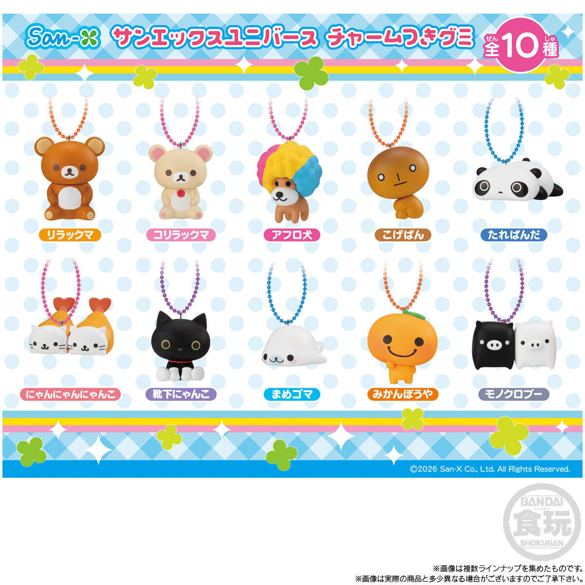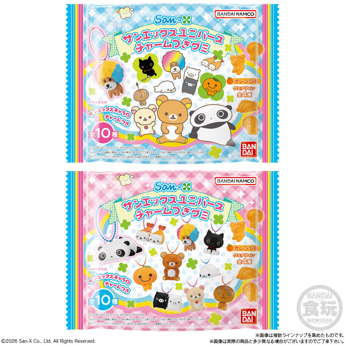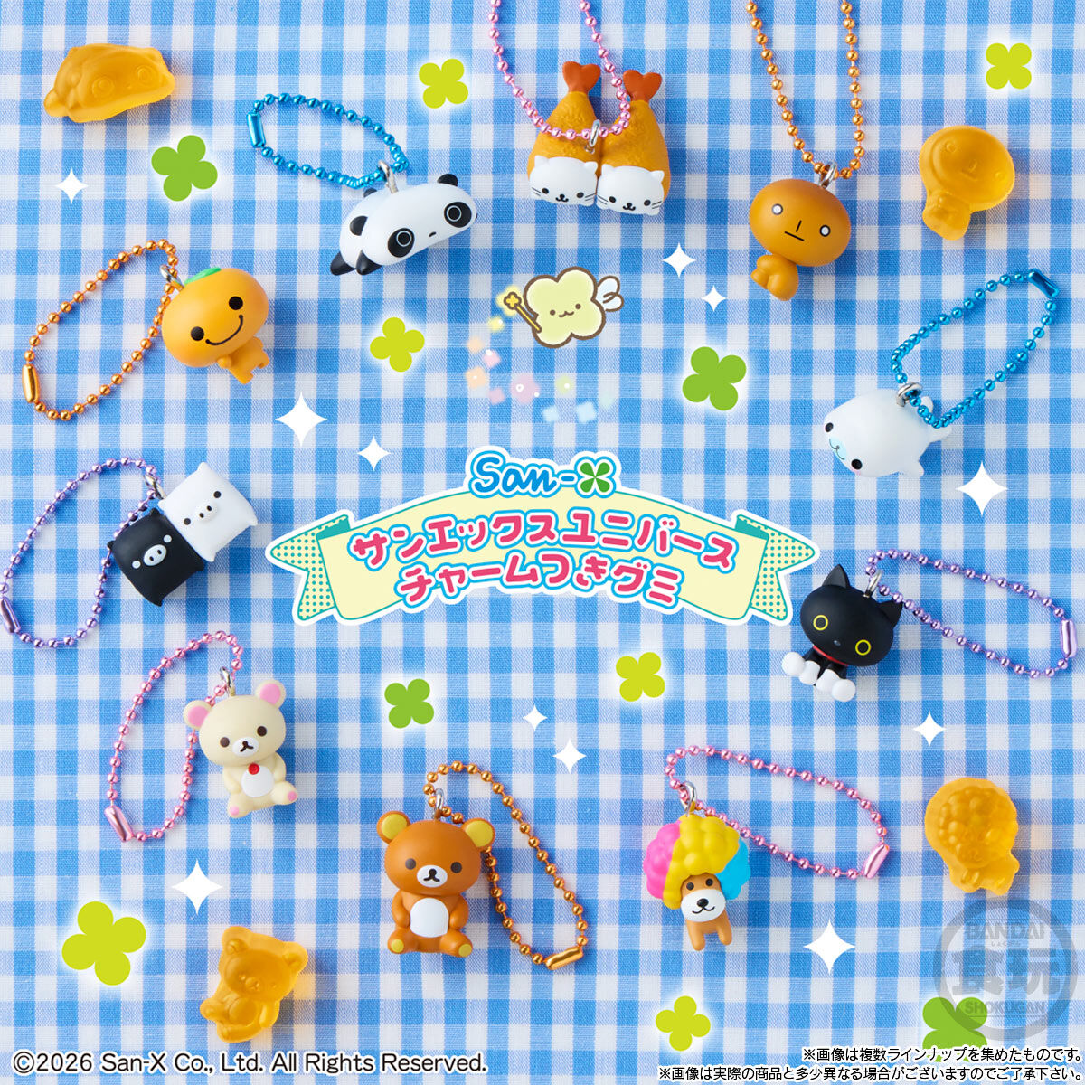 サンエックスユニバース チャームつきグミ お気に入り お気に入り登録とは? 価格 350円(税込:385円) 発売日 2026年1月5日 発売 売場 全国量販店の菓子売場等 対象年齢 15才以上 購入はこちら 商品アンケート サンエックスのキャラクターがボールチェーン付きマスコットになってお菓子売り場に登場! グミはオレンジ味でたくさんのキャラたちがラインナップ!形状は全4種!マスコットのラインナップは全10種!カラフルボールチェーンが付いているので、飾ったり、かばんやポーチにつけて持ち運ぶことができます。 どのキャラクターのチャーム・グミが出るかは開けてからのお楽しみ♪大人になったあなたに、あのころのトキメキをもう一度_______ ●サンエックスキャラチャーム(全10種)1.リラックマ2.コリラックマ3.アフロ犬4.こげぱん5.たれぱんだ6.にゃんにゃんにゃんこ7.靴下にゃんこ8.まめゴマ9.みかんぼうや10.モノクロブー●グミキャンディ27g (C)2026 San-X Co., Ltd. All Rights Reserved. ※画像には複数ラインナップを組み合わせて撮影したものも含まれます。 ※価格はメーカー希望小売価格表示です。 ※店頭での商品のお取り扱い開始日は、店舗によって異なる場合がございます。 ※画像は実際の商品とは多少異なる場合がございます。 ※掲載情報はページ公開時点のものです。予告なく変更になる場合がございます。