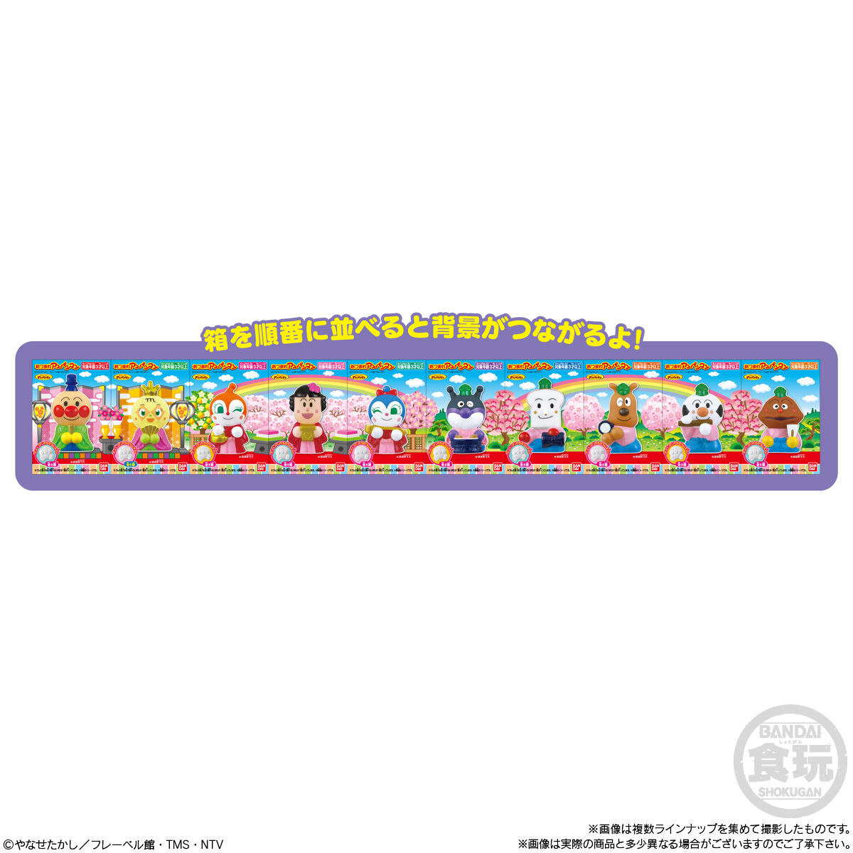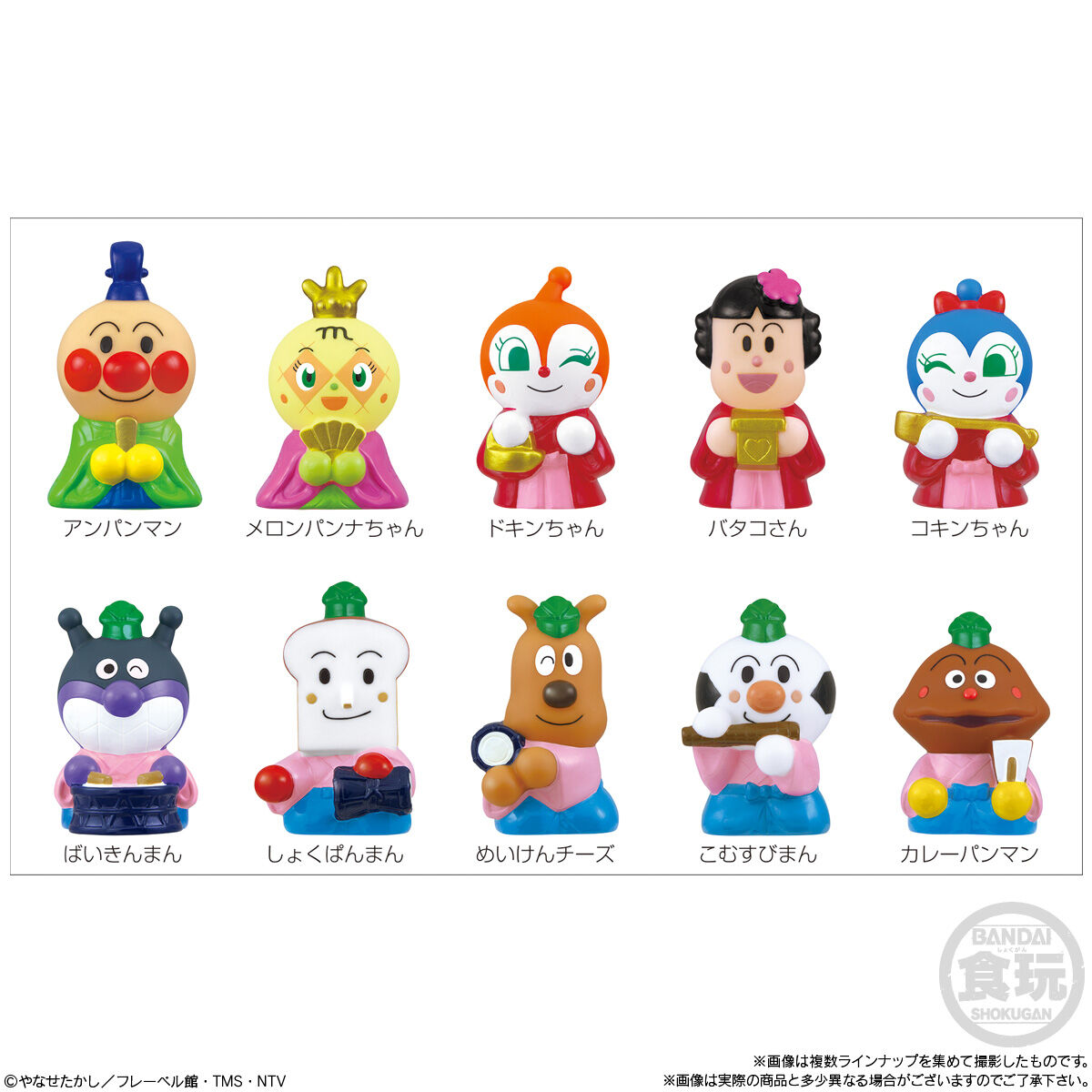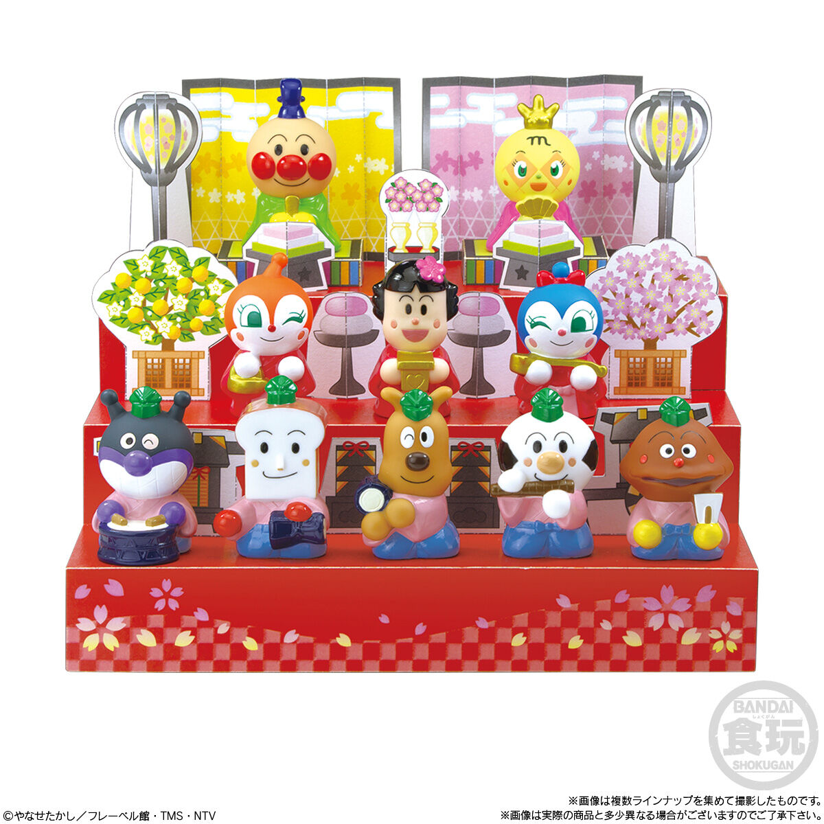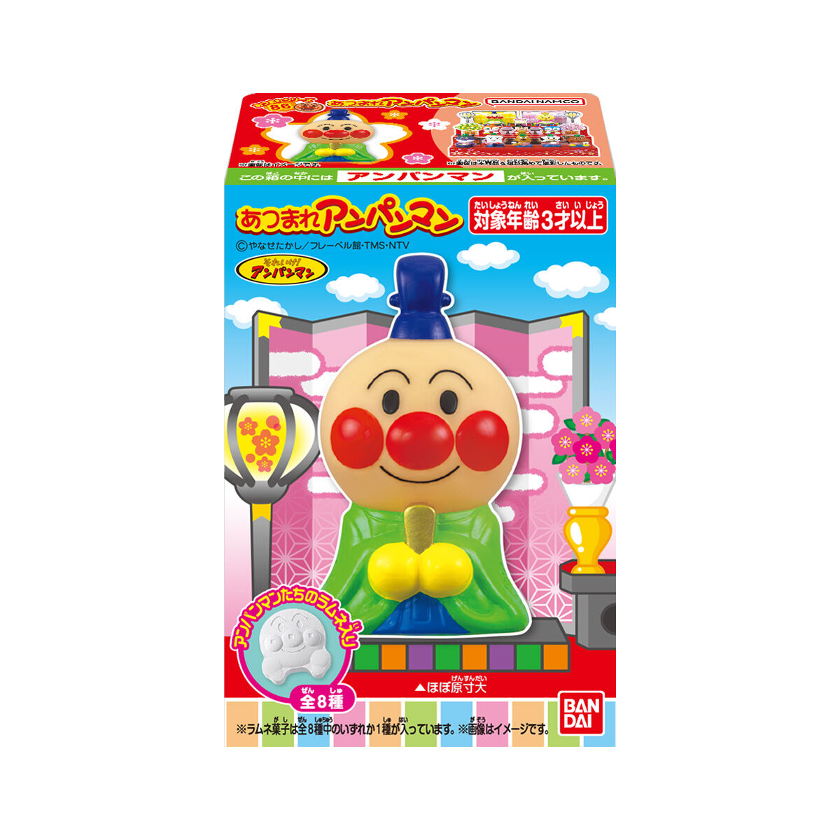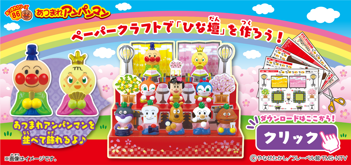 あつまれアンパンマンP86 お気に入り お気に入り登録とは? 価格 220円(税込:242円) 発売日 2026年1月19日 発売 売場 全国量販店の菓子売場等 対象年齢 3才以上 商品アンケート 『あつまれアンパンマン』シリーズ第86弾は「ひな祭り」がテーマ!お内裏さまのアンパンマン、お雛さまのメロンパンナちゃん、三人官女のドキンちゃん、バタコさん、コキンちゃんなど思わずひな壇に並べたくなっちゃうなかまたちが全10種♪ ●彩色済みソフビ人形1個(全10種)1.アンパンマン2.メロンパンナちゃん3.ドキンちゃん4.バタコさん5.コキンちゃん6.ばいきんまん7.しょくぱんまん8.めいけんチーズ9.こむすびまん10.カレーパンマン●ラムネ菓子1個 (C)やなせたかし/フレーベル館・TMS・NTV ※画像には複数ラインナップを組み合わせて撮影したものも含まれます。 ※価格はメーカー希望小売価格表示です。 ※店頭での商品のお取り扱い開始日は、店舗によって異なる場合がございます。 ※画像は実際の商品とは多少異なる場合がございます。 ※掲載情報はページ公開時点のものです。予告なく変更になる場合がございます。