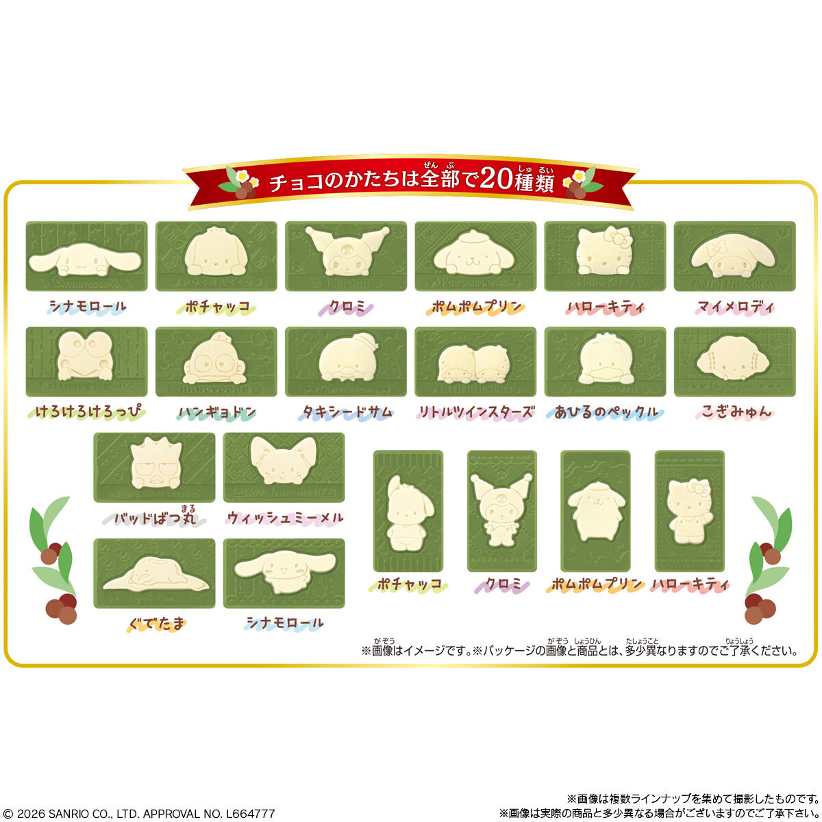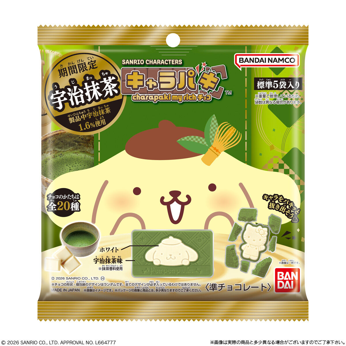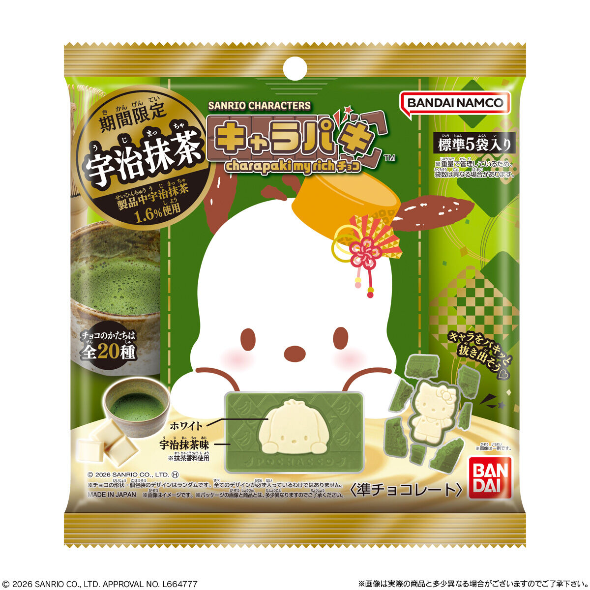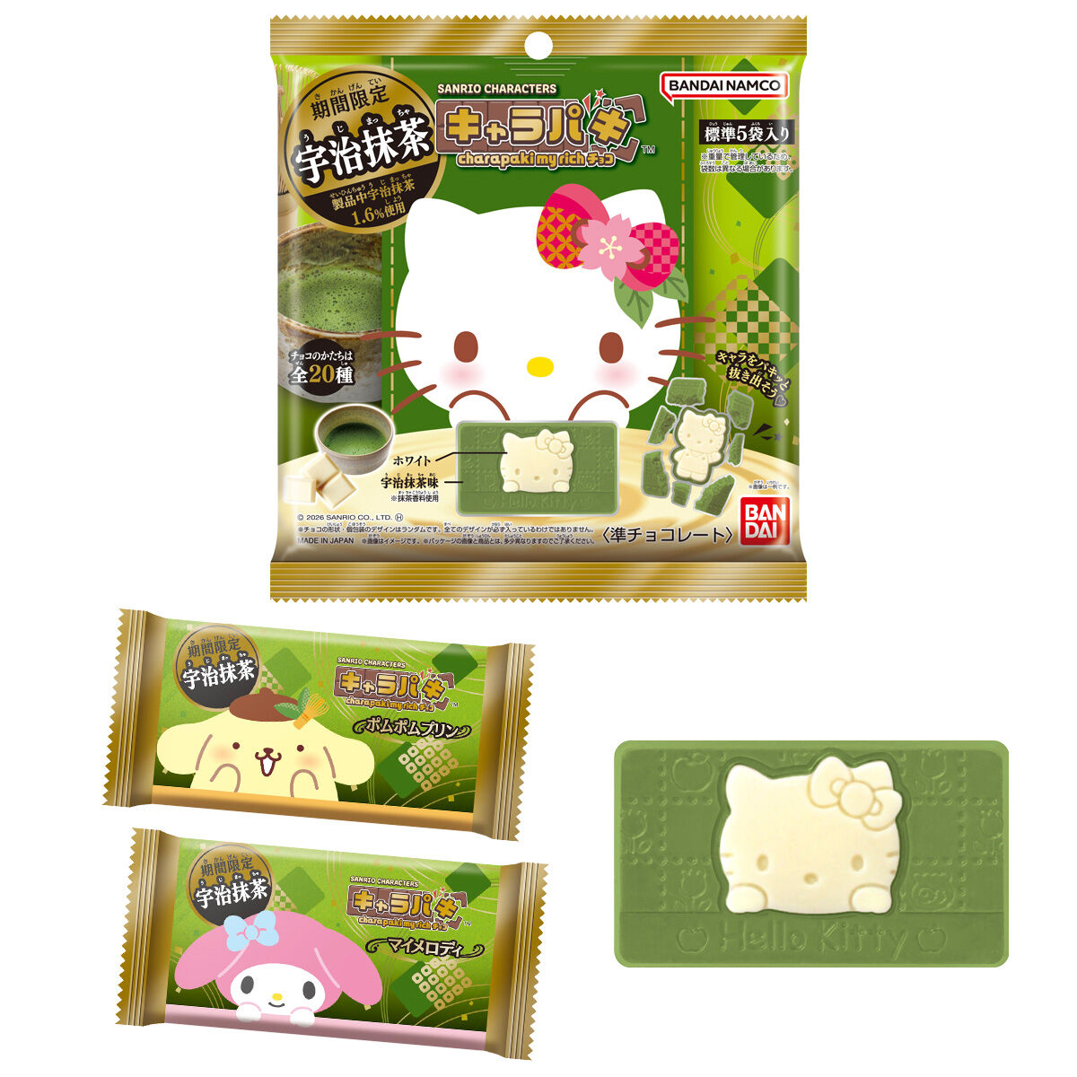 サンリオキャラクターズ キャラパキ charapaki my rich~宇治抹茶~ お気に入り お気に入り登録とは? 価格 238円(税込:257円) ※この商品は軽減税率8%対象商品です。 発売日 2026年1月12日 発売 売場 全国量販店の菓子売場等 商品アンケート 宇治抹茶味のパフ入りチョコレート×ホワイトチョコレートです。甘みと苦味のバランスが良い『宇治抹茶味』のキャラパキmyrichは、ついつい何度も食べたくなる美味しさ!まさにオトナのキャラパキ!?全15キャラターを収録したチョコ型は今日は誰に会えるかドキドキワクワク!便利な個包装品入りなので1個ずつ食べられます。 ●準チョコレート 5袋(全20種) (C)2026 SANRIO CO., LTD. APPROVAL NO. L664777 ※画像には複数ラインナップを組み合わせて撮影したものも含まれます。 ※価格はメーカー希望小売価格表示です。 ※店頭での商品のお取り扱い開始日は、店舗によって異なる場合がございます。 ※画像は実際の商品とは多少異なる場合がございます。 ※掲載情報はページ公開時点のものです。予告なく変更になる場合がございます。