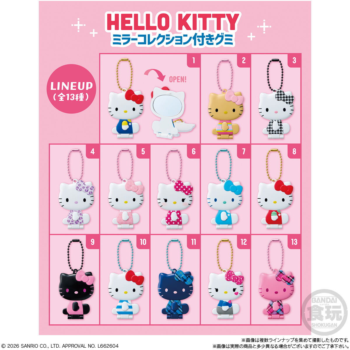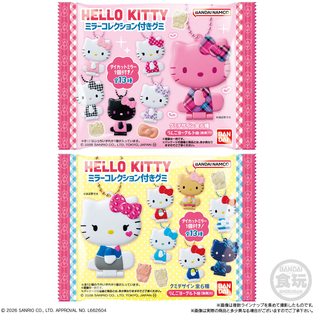 ハローキティ ミラーコレクション付きグミ お気に入り お気に入り登録とは? 価格 350円(税込:385円) 発売日 2026年4月20日 発売 売場 全国量販店の菓子売場等 対象年齢 15才以上 購入はこちら 商品アンケート ラインナップ全てが「ハローキティ」なミラーコレクション付きグミが登場♪キティちゃんのいろんな姿が楽しめちゃう♡約6cmのミラーが全13種!グミのかたちは全6種で、味はりんごヨーグルト味です。 ●ダイカットミラー1個(全13種)●グミキャンディ26g (C) 2026 SANRIO CO., LTD. APPROVAL NO. L662604 ※画像には複数ラインナップを組み合わせて撮影したものも含まれます。 ※価格はメーカー希望小売価格表示です。 ※店頭での商品のお取り扱い開始日は、店舗によって異なる場合がございます。 ※画像は実際の商品とは多少異なる場合がございます。 ※掲載情報はページ公開時点のものです。予告なく変更になる場合がございます。
