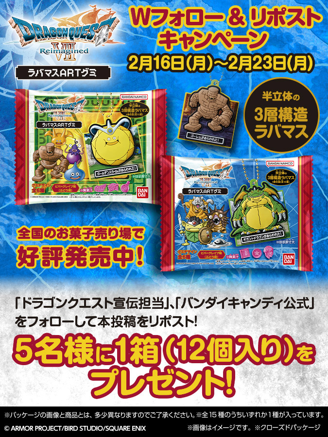 ●キャンペーン概要 ドラゴンクエスト宣伝担当【公式】X(旧:Twitter)アカウント(@DQ_PR)とバンダイ キャンディ公式X(旧:Twitter)アカウント(@candytoy_c)をフォローのうえ、対象の投稿をリポスト(リツイート)していただいた方の中から抽選で「ドラゴンクエストVII Reimagined ラバマスARTグミ」1箱(12個入り)を5名様にプレゼントいたします。 ●参加資格 利用規約に同意していただいた方 ●応募期間 2026年2月16日(月)~2月23日(月)23:59 ●応募方法 STEP1:ご自身のアカウントでX(旧:Twitter)にログイン STEP2:ドラゴンクエスト宣伝担当【公式】X(旧:Twitter)アカウント(@DQ_PR)とバンダイ キャンディ公式X(旧:Twitter)アカウント(@candytoy_c)をフォロー STEP3:対象の投稿をリポスト(リツイート) ※X(旧:Twitter)アカウントを非公開にしている場合、投稿を確認することができないため、本キャンペーンにはご参加いただけません。 ●賞品概要 抽選で5名様に「ドラゴンクエストVII Reimagined ラバマスARTグミ」1箱(12個入り) ●抽選発表 ご応募いただいた方の中から、厳正な抽選の上、当選者を決定いたします。 当選のご連絡は、2026年2月頃より順次、バンダイ キャンディ公式X(旧:Twitter)アカウント(@candytoy_c)からダイレクトメッセージで行います。 ●賞品の発送 2026年3月頃の発送を予定しております。 ※交通事情・天候・お住まいの地域や配送状況、その他諸事情によりお届けが前後する場合がございます。予めご了承ください。 ●注意事項 ・X(旧:Twitter)アカウントを非公開にしている場合、投稿を確認することができないため、本キャンペーンにはご参加いただけません。 ・ドラゴンクエスト宣伝担当【公式】X(旧:Twitter)アカウント(@DQ_PR)とバンダイ キャンディ公式X(旧:Twitter)アカウント(@candytoy_c)をフォローしていない場合や当選連絡を行う前にフォローを解除した場合は応募無効となります。 ・アカウント作成後の所定の設定を行っていない場合やアカウント作成直後にフォロー又はリポスト(リツイート)した場合など、当選対象外になる可能性があります。 ・ご当選者の個人情報取得後に同一人物、同一世帯による重複当選が確認された場合は、一つのアカウントのみ有効としそれ以外は無効とさせていただきます。 ・賞品画像はイメージです。 ・プレゼントの当選はお一人様につき1回のみです。 ・連絡及び賞品発送に関して、事務局からご連絡をさせていただく場合がございます。 ・X Corp.(旧Twitter, Inc.)が提供するX(旧:Twitter)サービスの利用規約に違反する行為を行った場合は当選権を失効させていただきます。 ・X(旧:Twitter)が提供するサービスのメンテナンスや不具合が発生した場合など、X(旧:Twitter)へのログインが行えない、投稿ができないなどの状況が発生した場合は、本キャンペーンにご応募いただけない可能性がございます。 ・未成年者の方は、本キャンペーンに応募する際、保護者の同意を得てご応募してください。 ・本キャンペーンの応募状況および抽選結果に関するお問い合わせにはお答えいたしかねますので、あらかじめご了承ください。 ・賞品は、予告無く変更になる場合があります。 ・厳正な抽選のうえ、当選者を決定します。 ・ご当選の権利はご当選者様ご本人のものとなり、他の方への譲渡、転売、換金はできません。 ・ご応募は日本国内にお住まいの方に限らせていただきます。 ・お客様の住所、氏名等の情報を正しくご記載いただいていない場合や、転居により住所が変更になった場合、住所不明や長期不在等で賞品がお届けできない場合は、当選されても権利が無効となる場合がございますのでご注意ください。 ・交通事情、天候等で賞品の発送が遅れる場合がございます。予めご了承ください。 ・ご応募に際してのインターネット通信料接続料はお客様の負担となります。 ・通信の際の接続トラブルにつきましては、責任を負いかねますので、ご了承ください。 ・本キャンペーンは、やむを得ない事情により中止または内容が変更となる場合がございますので、あらかじめご了承ください。 ・当社社員および関係者は応募できません。 ・本キャンペーンは「X(旧:Twitter)」を活用したキャンペーンです。X(旧:Twitter)に関連するアプリケーションの動作環境により発生する本キャンペーン運営の中断または中止によって万一何らかの損害が発生したとしても、当社は一切責任を負いません。 ●個人情報の取り扱い 当選時に入力していただいた個人情報は、別途当社が定める「個人情報保護方針」に基づき、厳重に管理いたします。 ●お問い合わせ <バンダイ キャンディキャンペーンナビ> 電話番号 0570-082-315 受付時間 10時〜16時(土、日、祝日、夏季冬季休業日を除く)
