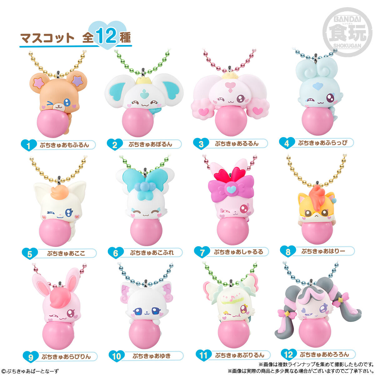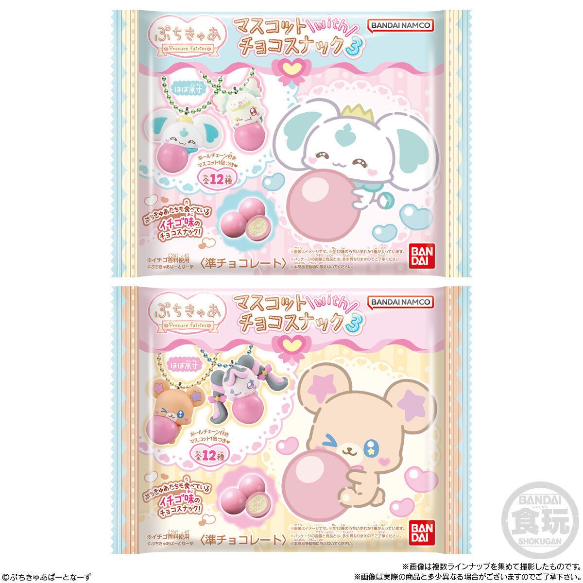 ぷちきゅあマスコットwithチョコスナック3 お気に入り お気に入り登録とは? 価格 350円(税込:385円) 発売日 2026年4月27日 発売 売場 全国量販店の菓子売場等 対象年齢 3才以上 購入はこちら 商品アンケート プリキュアのスピンオフシリーズ、ショートアニメ『ぷちきゅあ~Precure Fairies~』に出てくるプリキュアのちいさななかまたち「ぷちきゅあ」のボールチェーン付きマスコット第3弾が登場!チョコスナックをむぎゅっと持っている新フォーマットで、カバンなどにつけても可愛い!イチゴ味のチョコスナック付きだよ! ●ボールチェーン付きマスコット1個(全12種)1.ぷちきゅあもふるん2.ぷちきゅあぽるん3.ぷちきゅあるるん4.ぷちきゅあふらっぴ5.ぷちきゅあここ6.ぷちきゅあこふれ7.ぷちきゅあしゃるる8.ぷちきゅあはりー9.ぷちきゅあらびりん10.ぷちきゅあゆき11.ぷちきゅあぷりるん 12.ぷちきゅあめろろん ●チョコスナック16g (C)ぷちきゅあぱーとなーず ※画像には複数ラインナップを組み合わせて撮影したものも含まれます。 ※価格はメーカー希望小売価格表示です。 ※店頭での商品のお取り扱い開始日は、店舗によって異なる場合がございます。 ※画像は実際の商品とは多少異なる場合がございます。 ※掲載情報はページ公開時点のものです。予告なく変更になる場合がございます。