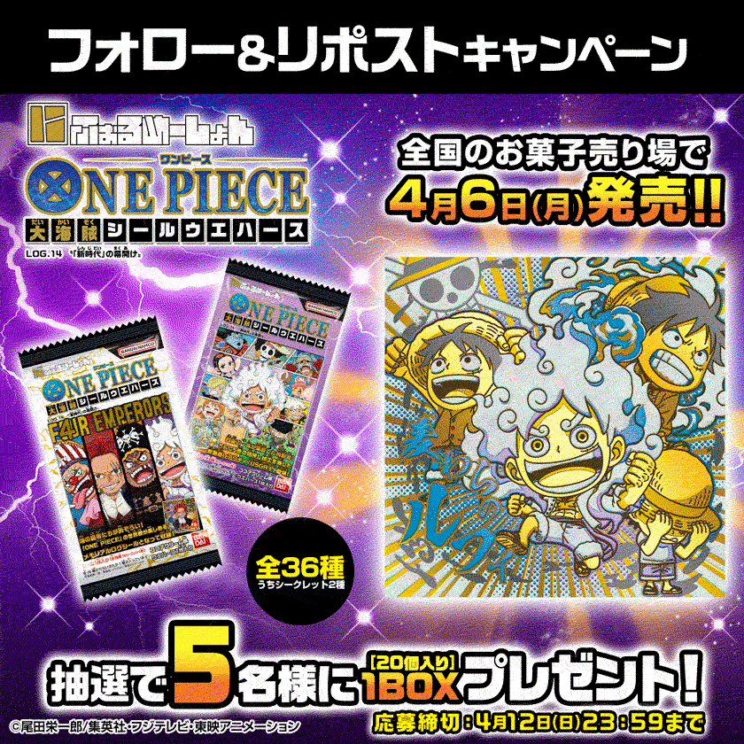 ●キャンペーン概要 バンダイ キャンディ公式X(旧:Twitter)アカウント(@candytoy_c)をフォローのうえ、対象の投稿をリポスト(リツイート)していただいた方の中から抽選で「にふぉるめーしょん ワンピース大海賊シールウエハースLOG.14」1箱(20個入り)を5名様にプレゼントいたします。 ●参加資格 利用規約に同意していただいた方 ●応募期間 2026年3月30日(月)~4月12日(日)23:59 ●応募方法 STEP1:ご自身のアカウントでX(旧:Twitter)にログイン STEP2:バンダイ キャンディ公式X(旧:Twitter)アカウント(@candytoy_c)をフォロー STEP3:対象の投稿をリポスト(リツイート) ※X(旧:Twitter)アカウントを非公開にしている場合、投稿を確認することができないため、本キャンペーンにはご参加いただけません。 ●賞品概要 抽選で5名様に「にふぉるめーしょん ワンピース大海賊シールウエハースLOG.14」1箱(20個入り) ●抽選発表 ご応募いただいた方の中から、厳正な抽選の上、当選者を決定いたします。 当選のご連絡は、2026年4月頃より順次、バンダイ キャンディ公式X(旧:Twitter)アカウント(@candytoy_c)からダイレクトメッセージで行います。 ●賞品の発送 2026年4月頃の発送を予定しております。 ※交通事情・天候・お住まいの地域や配送状況、その他諸事情によりお届けが前後する場合がございます。予めご了承ください。 ●注意事項 ・X(旧:Twitter)アカウントを非公開にしている場合、投稿を確認することができないため、本キャンペーンにはご参加いただけません。 ・バンダイ キャンディ公式X(旧:Twitter)アカウント(@candytoy_c)をフォローしていない場合や当選連絡を行う前にフォローを解除した場合は応募無効となります。 ・アカウント作成後の所定の設定を行っていない場合やアカウント作成直後にフォロー又はリポスト(リツイート)した場合など、当選対象外になる可能性があります。 ・ご当選者の個人情報取得後に同一人物、同一世帯による重複当選が確認された場合は、一つのアカウントのみ有効としそれ以外は無効とさせていただきます。 ・賞品画像はイメージです。 ・プレゼントの当選はお一人様につき1回のみです。 ・連絡及び賞品発送に関して、事務局からご連絡をさせていただく場合がございます。 ・X Corp.(旧Twitter, Inc.)が提供するX(旧:Twitter)サービスの利用規約に違反する行為を行った場合は当選権を失効させていただきます。 ・X(旧:Twitter)が提供するサービスのメンテナンスや不具合が発生した場合など、X(旧:Twitter)へのログインが行えない、投稿ができないなどの状況が発生した場合は、本キャンペーンにご応募いただけない可能性がございます。 ・未成年者の方は、本キャンペーンに応募する際、保護者の同意を得てご応募してください。 ・本キャンペーンの応募状況および抽選結果に関するお問い合わせにはお答えいたしかねますので、あらかじめご了承ください。 ・賞品は、予告無く変更になる場合があります。 ・厳正な抽選のうえ、当選者を決定します。 ・ご当選の権利はご当選者様ご本人のものとなり、他の方への譲渡、転売、換金はできません。 ・ご応募は日本国内にお住まいの方に限らせていただきます。 ・お客様の住所、氏名等の情報を正しくご記載いただいていない場合や、転居により住所が変更になった場合、住所不明や長期不在等で賞品がお届けできない場合は、当選されても権利が無効となる場合がございますのでご注意ください。 ・交通事情、天候等で賞品の発送が遅れる場合がございます。予めご了承ください。 ・ご応募に際してのインターネット通信料接続料はお客様の負担となります。 ・通信の際の接続トラブルにつきましては、責任を負いかねますので、ご了承ください。 ・本キャンペーンは、やむを得ない事情により中止または内容が変更となる場合がございますので、あらかじめご了承ください。 ・当社社員および関係者は応募できません。 ・本キャンペーンは「X(旧:Twitter)」を活用したキャンペーンです。X(旧:Twitter)に関連するアプリケーションの動作環境により発生する本キャンペーン運営の中断または中止によって万一何らかの損害が発生したとしても、当社は一切責任を負いません。 ●個人情報の取り扱い 当選時に入力していただいた個人情報は、別途当社が定める「個人情報保護方針」に基づき、厳重に管理いたします。 ●お問い合わせ <バンダイ キャンディキャンペーンナビ> 電話番号 0570-082-315 受付時間 10時〜16時(土、日、祝日、夏季冬季休業日を除く)