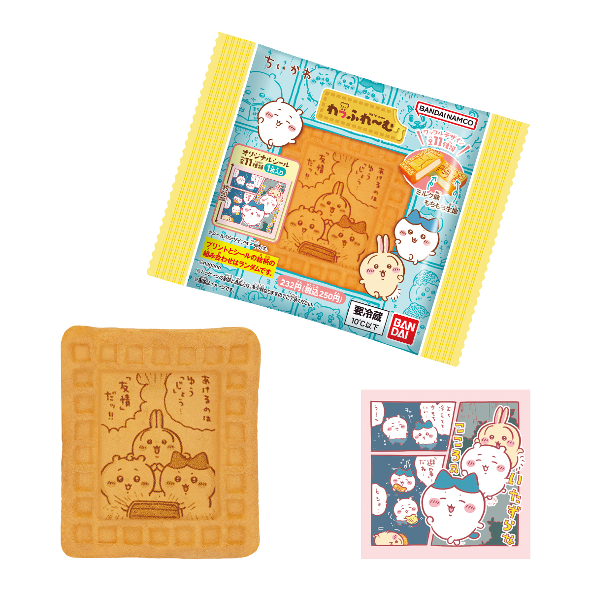 ちいかわ わっふれ~む2 お気に入り お気に入り登録とは? 価格 232円(税込:250円) ※この商品は軽減税率8%対象商品です。 発売日 2026年1月27日 発売 売場 全国のファミリーマート(一部店舗を除く)のチルドスイーツコーナー 対象年齢 3才以上 商品アンケート ちいかわの「わっふれ~む」第2弾が登場! ワッフルの凹凸を生かして、フレームに見立てたもちもち生地の表面に 高精細なデザインをプリントした、ミルク味のクリーム入りワッフルです! ワッフルには、「ちいかわ」のイラスト全11種類をプリントしています。 さらに、約50mm×約50mmの正方形シール1枚付き! シールは、全11種類のオリジナルデザインとなっています。ファミリーマート限定発売です。 ●洋生菓子1個 ●シール1枚入り(全11種) (C)nagano ※画像には複数ラインナップを組み合わせて撮影したものも含まれます。 ※価格はメーカー希望小売価格表示です。 ※店頭での商品のお取り扱い開始日は、店舗によって異なる場合がございます。 ※画像は実際の商品とは多少異なる場合がございます。 ※画像はイメージです。 ※掲載情報はページ公開時点のものです。予告なく変更になる場合がございます。 ※開封後は消費期限にかかわらず、お早めに召し上がってください。 ※生地の黒い斑点は焦げです。品質に問題はございません。 ※クリームが生地の表面についていることがありますが、品質に問題はございません。 ※召し上がり方 冷蔵庫で冷やして、そのまま召し上がってください。