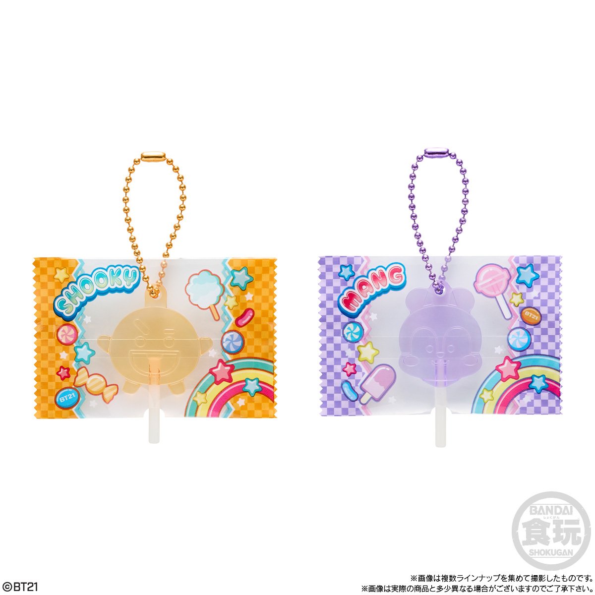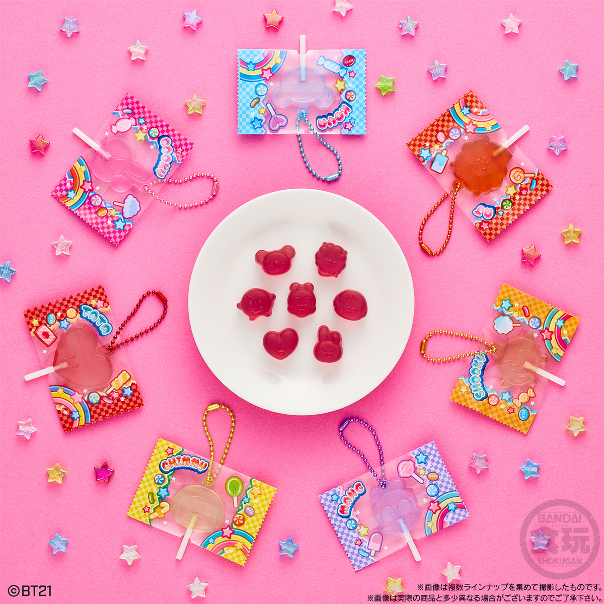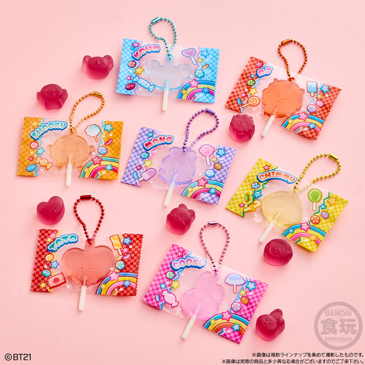 BT21 キャンディチャームズ&グミ お気に入り お気に入り登録とは? 価格 360円(税込:396円) 発売日 2026年10月 発売 売場 全国量販店の菓子売場等 対象年齢 15才以上 商品アンケート BT21が、キャンディみたいなチャーム「キャンディチャームズ」になりました! カラフルなチャームは、まるで本物のキャンディみたい! BT21たちの形をしたグレープ味のグミに、ペロペロキャンディ風チャームが1個付きます。 カラフルボールチェーンが付いているので、飾ったり、かばんやポーチにつけて持ち運ぶのにもピッタリ♪ チャームのラインナップは全7種! ※キャンディチャームは食べられません。 ●キャンディチャームズ1個(全7種) 1.KOYA 2.RJ 3.SHOOKY 4.MANG 5.CHIMMY 6.TATA 7.COOKY ●グミキャンディ27g (C)BT21 ※画像には複数ラインナップを組み合わせて撮影したものも含まれます。 ※価格はメーカー希望小売価格表示です。 ※店頭での商品のお取り扱い開始日は、店舗によって異なる場合がございます。 ※画像は実際の商品とは多少異なる場合がございます。 ※掲載情報はページ公開時点のものです。予告なく変更になる場合がございます。
