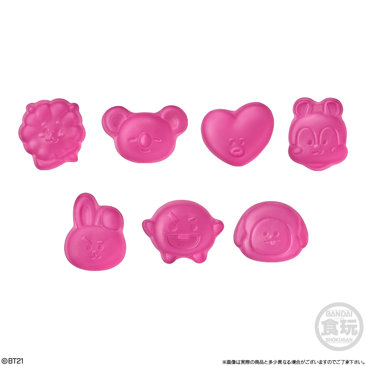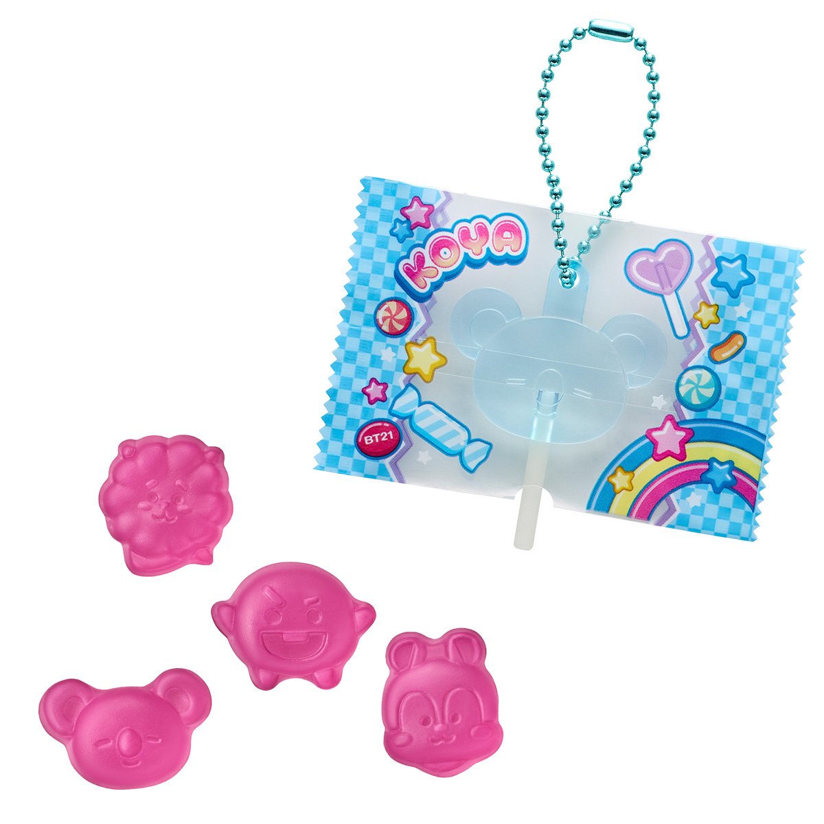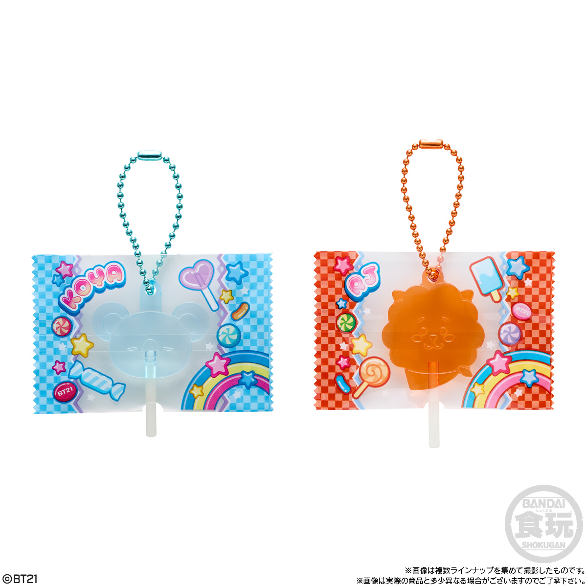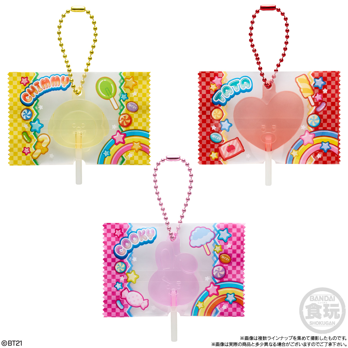BT21 キャンディチャームズ&グミ お気に入り お気に入り登録とは? 価格 360円(税込:396円) 発売日 2026年10月 発売 売場 全国量販店の菓子売場等 対象年齢 15才以上 商品アンケート BT21が、キャンディみたいなチャーム「キャンディチャームズ」になりました! カラフルなチャームは、まるで本物のキャンディみたい! BT21たちの形をしたグレープ味のグミに、ペロペロキャンディ風チャームが1個付きます。 カラフルボールチェーンが付いているので、飾ったり、かばんやポーチにつけて持ち運ぶのにもピッタリ♪ チャームのラインナップは全7種! ※キャンディチャームは食べられません。 ●キャンディチャームズ1個(全7種) 1.KOYA 2.RJ 3.SHOOKY 4.MANG 5.CHIMMY 6.TATA 7.COOKY ●グミキャンディ27g (C)BT21 ※画像には複数ラインナップを組み合わせて撮影したものも含まれます。 ※価格はメーカー希望小売価格表示です。 ※店頭での商品のお取り扱い開始日は、店舗によって異なる場合がございます。 ※画像は実際の商品とは多少異なる場合がございます。 ※掲載情報はページ公開時点のものです。予告なく変更になる場合がございます。