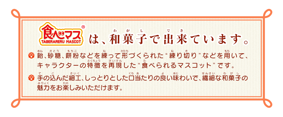 - 白生餡(国内製造)、加糖餡(いんげん豆、砂糖、還元水飴、加糖練乳、寒天)、砂糖、還元水飴、餅粉、上用粉(うるち米)、麦芽糖、植物油脂/酵素、着色料(クチナシ、炭末)、香料、増粘剤(加工澱粉)、(一部に卵・乳成分を含む)
