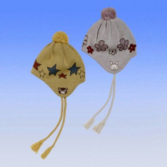 ARANZI ARONZO kodomo × e.a.Bシリーズ。ジャガードが大胆に入ったニット帽は、耳あて付きで寒い日も大丈夫!星×くまくん、花×しろうさの2柄。