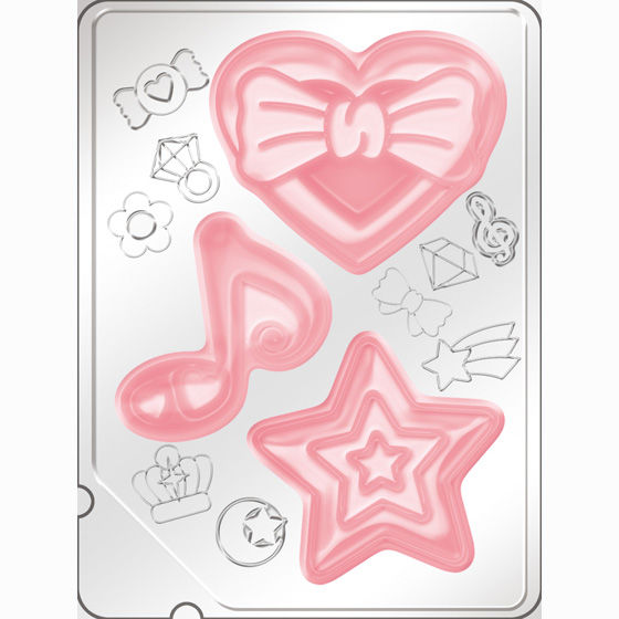 新番組『ドキドキ!プリキュア』のイラストが入ったキラキラしたカードとピーチ味の果汁入りトレーグミ(トレー1枚にグミが3個付き)のセットだよ!すべて豪華なゴールド加工のカードで、両面にかわいいイラストが入っていてかわいさ満点です。