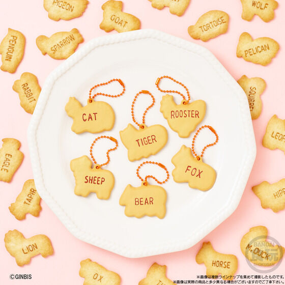 ビスケットをリアルに再現した6種と、「たべっ子どうぶつ」の仲間たちの今回の商品だけのオリジナルイラストを使用した8種の、全14種のぷっくり半立体のラバーマスコットがランダムで付属します。
