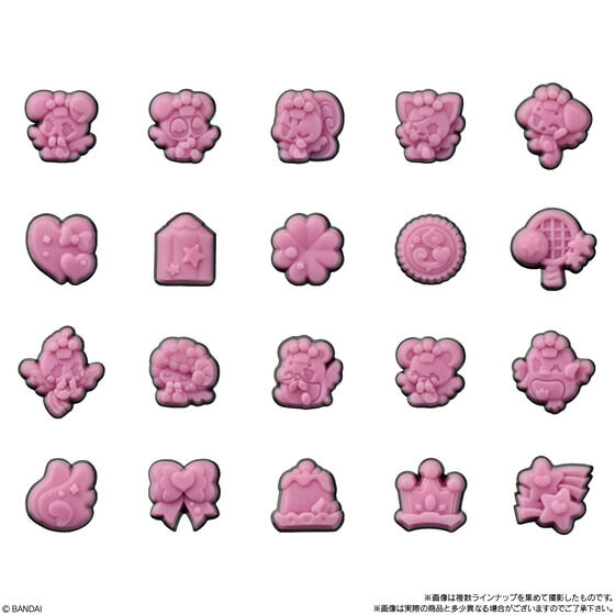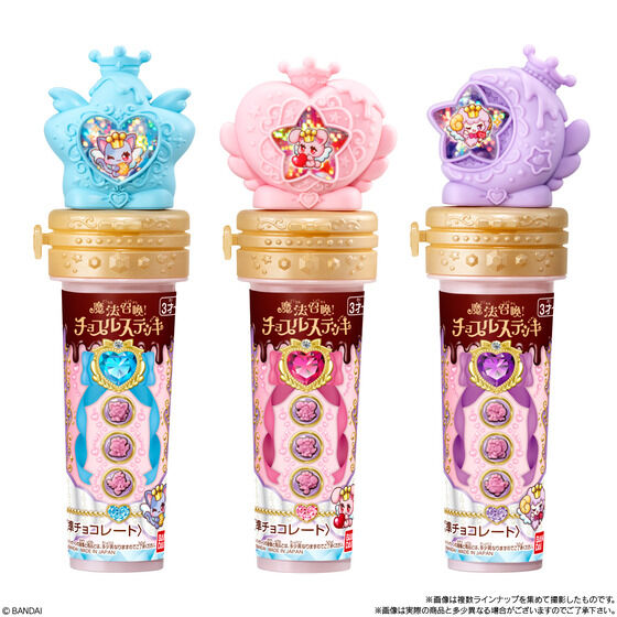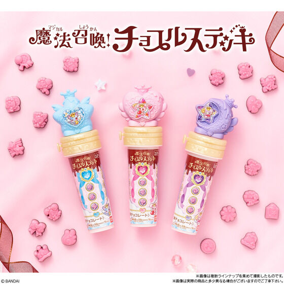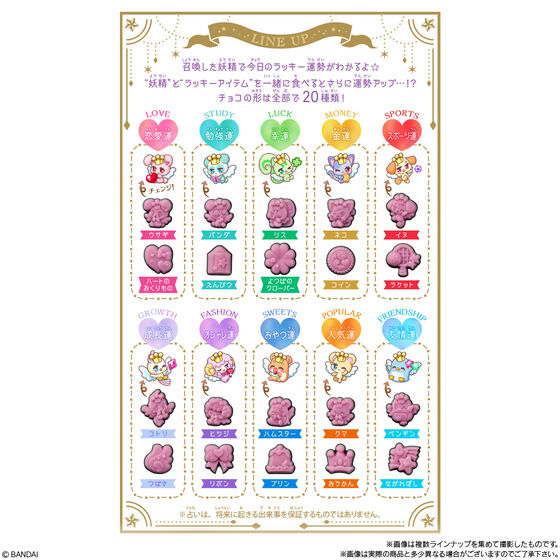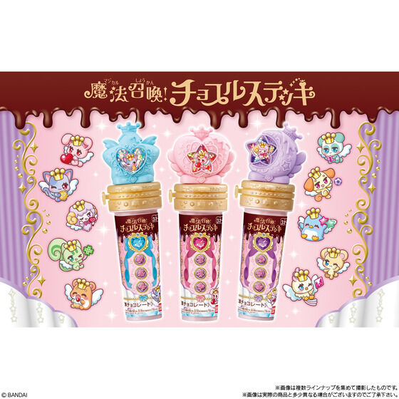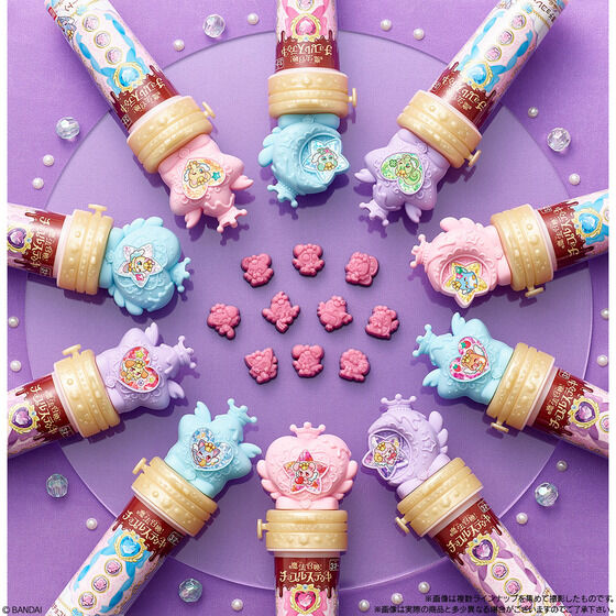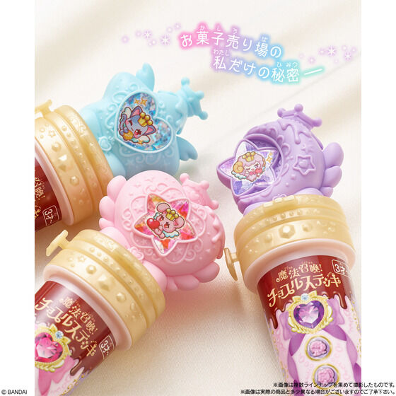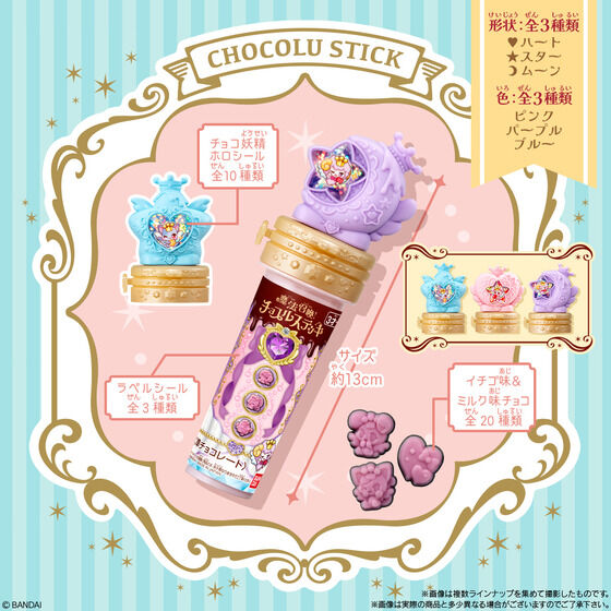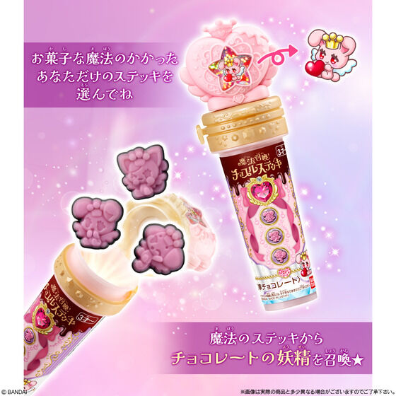 女の子が握りやすいサイズの容器×イチゴ味&ミルク味の2層チョコレートで、容器もお菓子もどちらも楽しめます。容器は3種類の形状、チョコレートは可愛い妖精チョコとラッキーアイテムが占えるおまじないチョコの2つのデザイン構成で全20種。チョコレート約10粒が入っています。