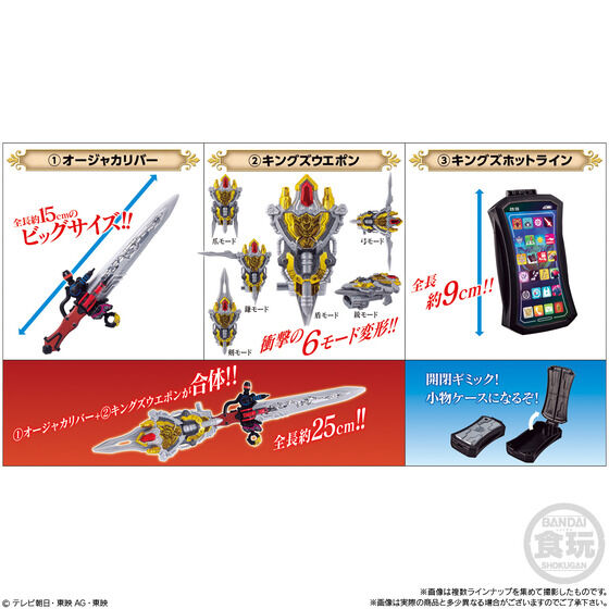 1.オージャーカリバーや2.キングズウエポンは玩具同等のギミックが再現でき、武器同士の合体も再現可能!3.キングズホットラインは開閉式になっていて小物を収納することができます。