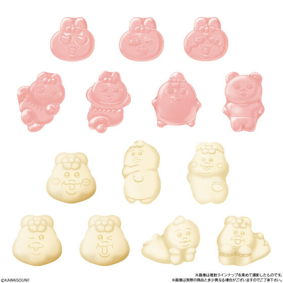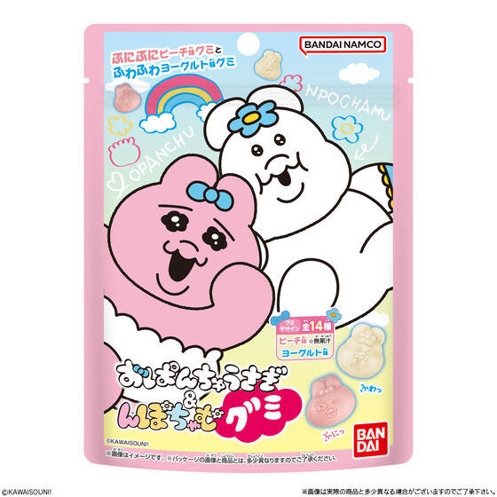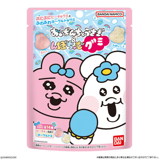 おぱんちゅうさぎのぷにぷにピーチ味グミと、んぽちゃむのふわふわヨーグルト味グミの2つの味が楽しめます。グミのかたちは全14種!