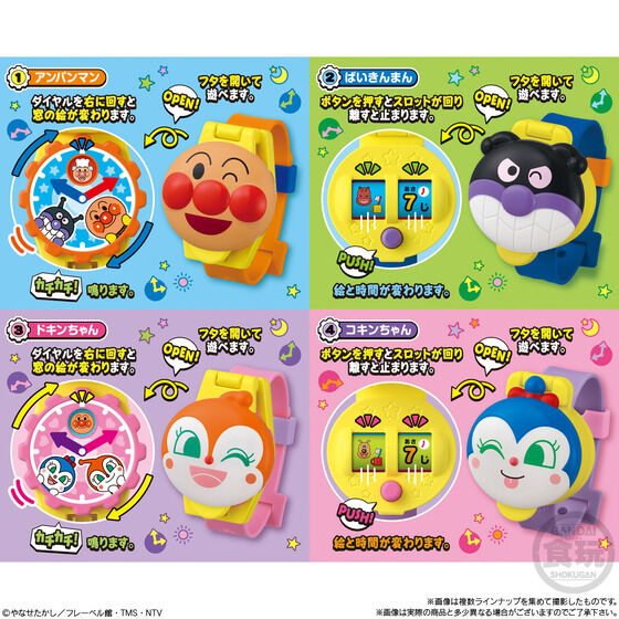 アンパンマン、ばいきんまん、ドキンちゃん、コキンちゃんの全4種です。