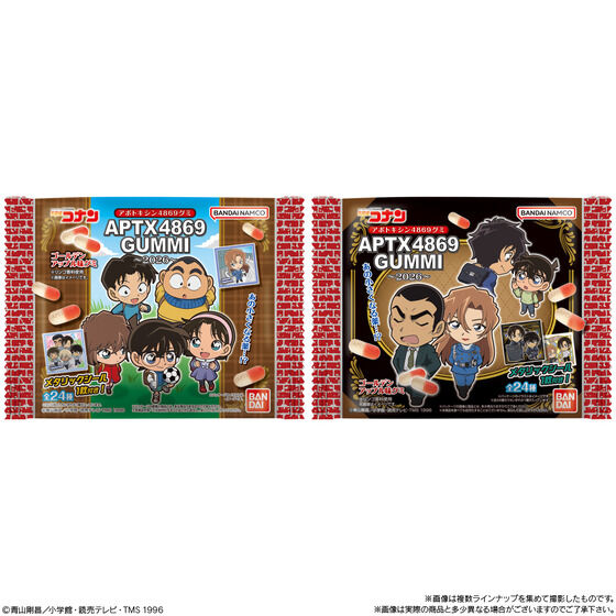 大人気作品「名探偵コナン」の、物語のキーアイテムである「APTX(アポトキシン)4869」を模したモールドグミとメタリックシールがセットになった商品です。