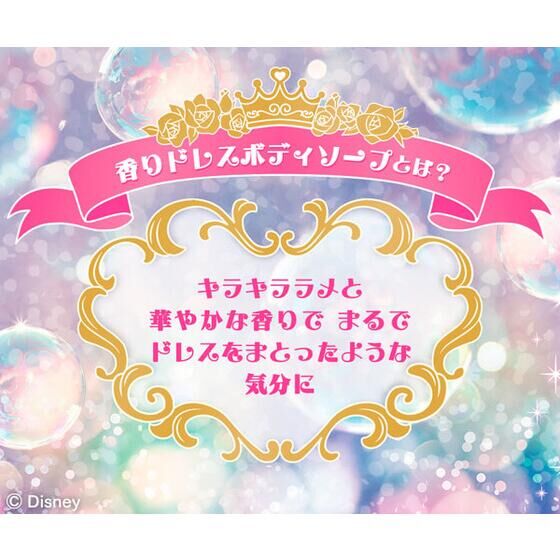 まるでドレスのような、キャラクターをイメージしたドレスデザインが施されたボトルからは、キラキラとラメが輝くボディソープが出てきます。