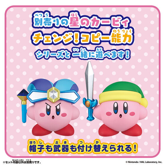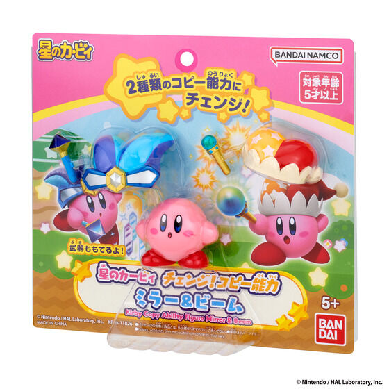 ゲーム中のカービィと同様に、ノーマル姿のカービィから、ミラーとビーム、ステッキを持った2つのコピー能力に変身できるフィギュアのセットです。