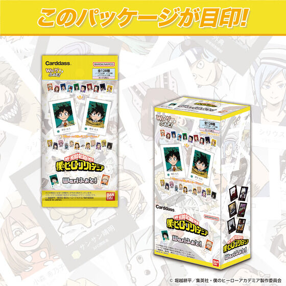 収録キャラクター約170名!! TVアニメ『僕のヒーローアカデミア FINAL SEASON』までの作中に登場した様々なキャラクター達が大集合する特別弾!緑谷や爆豪たちA組の仲間など、メインキャラクターは1パックに必ず1枚封入!さらにレアパラレルは豪華な金色箔仕様!1パック2枚入り、1ボックス10パック入り。 ※『Wariふぉと』は1枚のカードが2枚のミニカードになるバンダイコレクションカードの新商品です。
