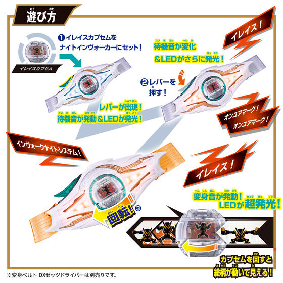 「変身ベルトDXゼッツドライバー(別売り)」のバックルを付け替えることで、「ナイトインヴォーカー」となります。