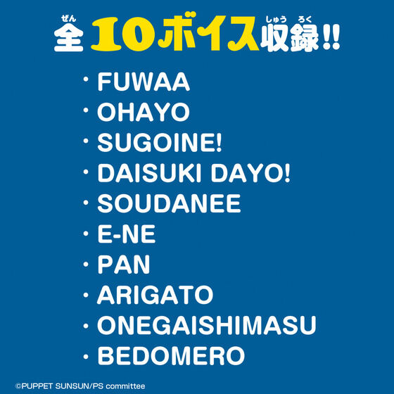 お腹を押すとおしゃべりする、スンスンのぬいぐるみです♪「FUWAA」や「BEDOMERO」など、全10種の音声が入っていてスンスンの声が楽しめます! 全長約280mm