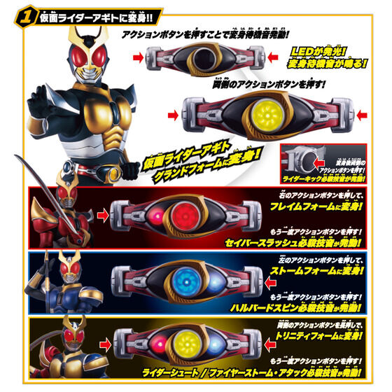 グランドフォームをはじめとした4フォームに加え、付属のドラゴンズネイル装着によるバーニングフォーム、シャイニングフォームなど計6フォームに変身することが可能!