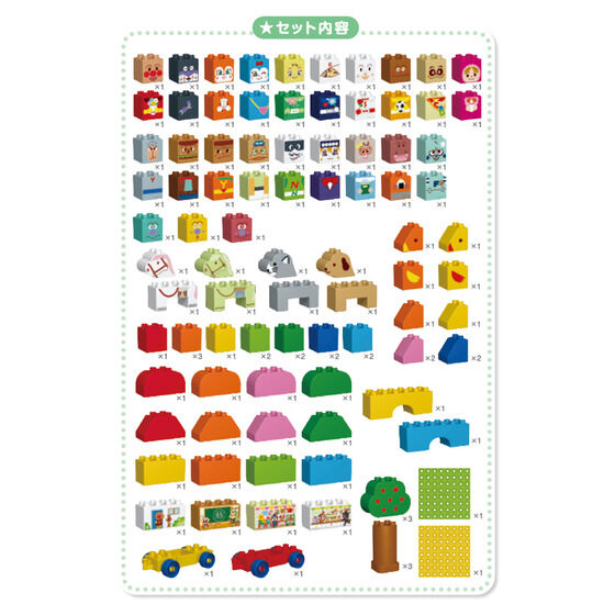 アンパンマン、ばいきんまん、ドキンちゃんたちはもちろん、みみせんせいやカバおなどのまちのなかまたちや、やきそばパンマンとソース、ハンバーガーキッドとピクルスなど、人気のキャラクターが全22体! 定番の正方形や長方形ブロック、動物、木などお子さまの想像力が広がるブロックもたっぷり55ピース入り!