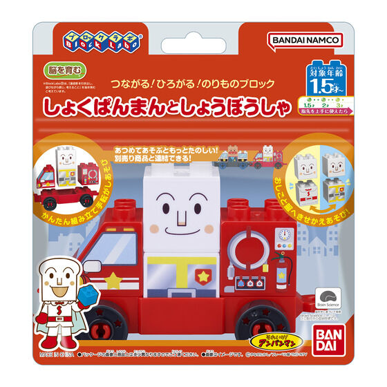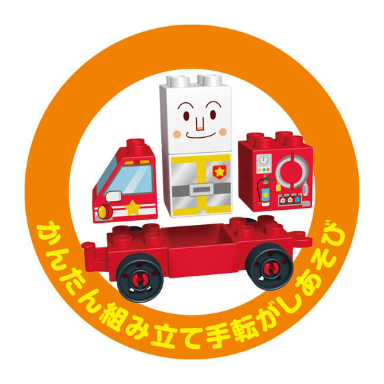 小さなお子さまでも簡単に組み立てて、手転がし遊びができるしょくぱんまんと消防車のブロックセットです。