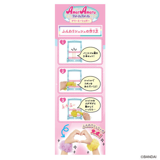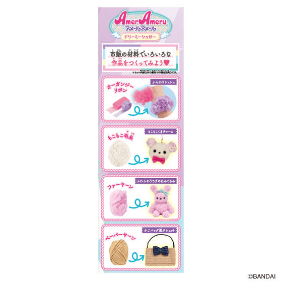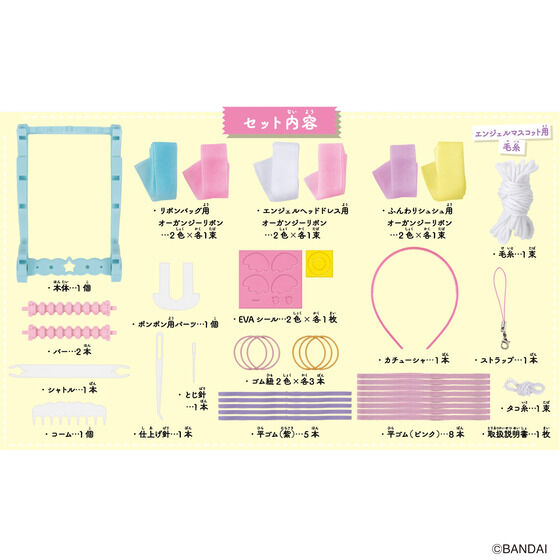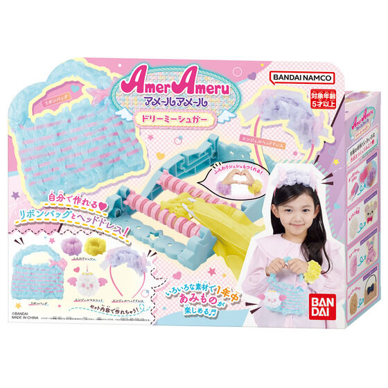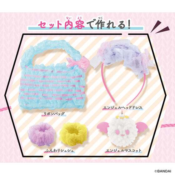 いろいろな素材で簡単にあみものが楽しめるメイキングトイ『アメールアメール』がリニューアルして登場!水色×ピンクのエンジェルをテーマに、バッグやヘアアクセサリーが自分で作れます。セット内容だけでリボンバッグ・エンジェルヘッドドレス・エンジェルマスコット・ふんわりシュシュ×2個が作れます。
