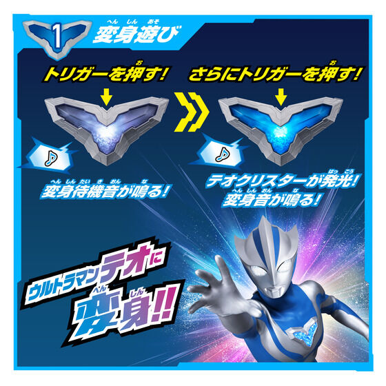 変身後には、ウルトラマンテオの掛け声や攻撃音など、劇中のバトルシーンを再現した効果音を鳴らすことができます。