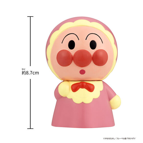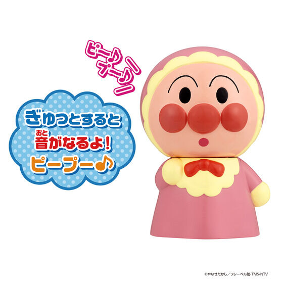 「それいけ!アンパンマン」に登場する「あかちゃんアンパンマン」の首が可動する、お人形のおもちゃです。ソフビ製で手のひらサイズ(約8.7cm)なので、軽くて握りやすく低年齢のお子様にも遊びやすいです。鳴き笛としても楽しめます。