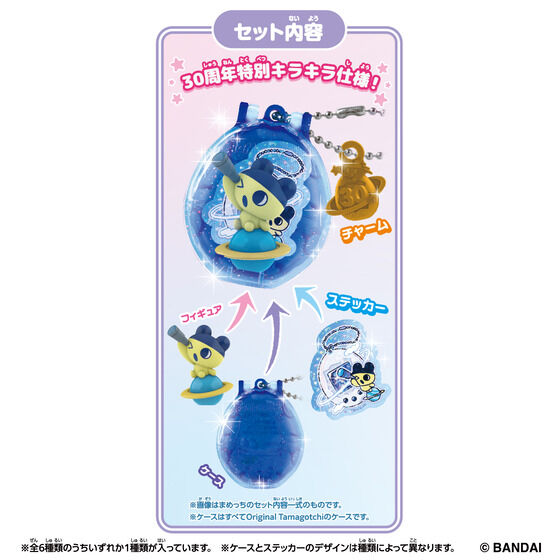 たまごっちのかわいい日常が集めて楽しい「フィギュア」になったTamagotchi Collectiblesシリーズより、30周年を記念して、歴代の人気たまごっちが登場!スペシャルチャーム付きケース・キラキラステッカーが付属する特別仕様!
