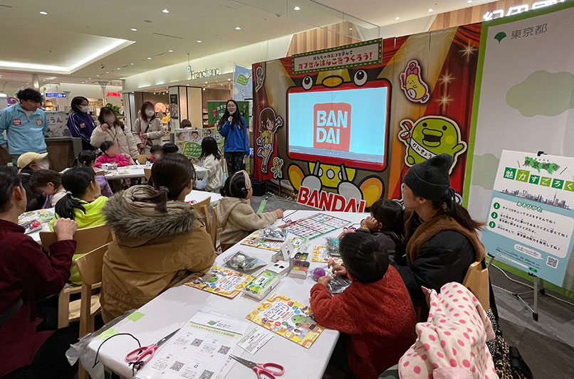バンダイでは「未来・クリエイション」プロジェクトを推進し、サステナビリティに向けた3つの目標を掲げており、その中の1つである“未来を担う子どもたちに向けた教育・体験価値の提供”として、東京都が推進する「こどもスマイルムーブメント」に賛同しています。そこでこの度は2月23日(金・祝)にアリオ亀有にて開催された「こどもスマイルムーブメント」主催の“子供・子育て世代向けブース”に協力し、カプセルトイの空カプセルを再利用して作る「カプセルはんこ工作」を体験いただきました。当日はバンダイのサステナブルな取り組みを映像で紹介することで、環境についても学べるプログラムを実施。体験会は17回実施し、合計137名の方にご参加いただきました。