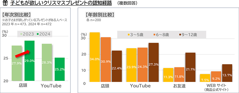 欲しいクリスマスプレゼントの認知経路については、「店頭(29%)」が1位となり、リアル回帰の傾向が見られました。