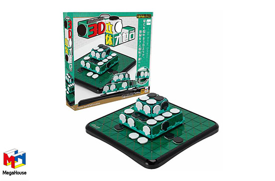 立体盤を配置することで、オセロ盤が“縦”に拡がる今までに無い新感覚のオセロです。基本のルールは通常のオセロと同様ですが、側面や斜めなど予想ができないところから攻撃が来るため、通常のオセロよりもゲームが複雑になります。一方で、立体盤は大小2つ付属しており自由に置き換えられるので、さまざまな配置で難易度を調整しながら楽しめます。3Dの盤面が起こす複雑難解な予想外の展開や、一対一だけでなくチーム戦で話し合いながらの対戦もお楽しみいただけます。
